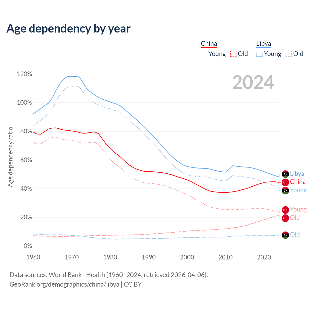 - China is ranked 44/196 by median age (oldest to youngest) vs 114/196 for Libya.