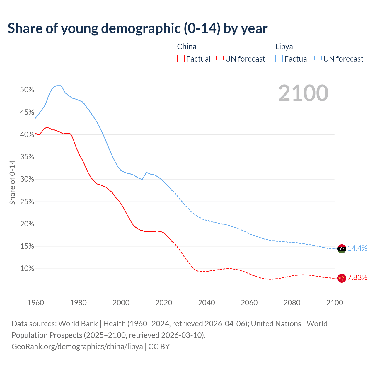 - The total fertility rate is 1 in China compared to 2.36 in Libya.