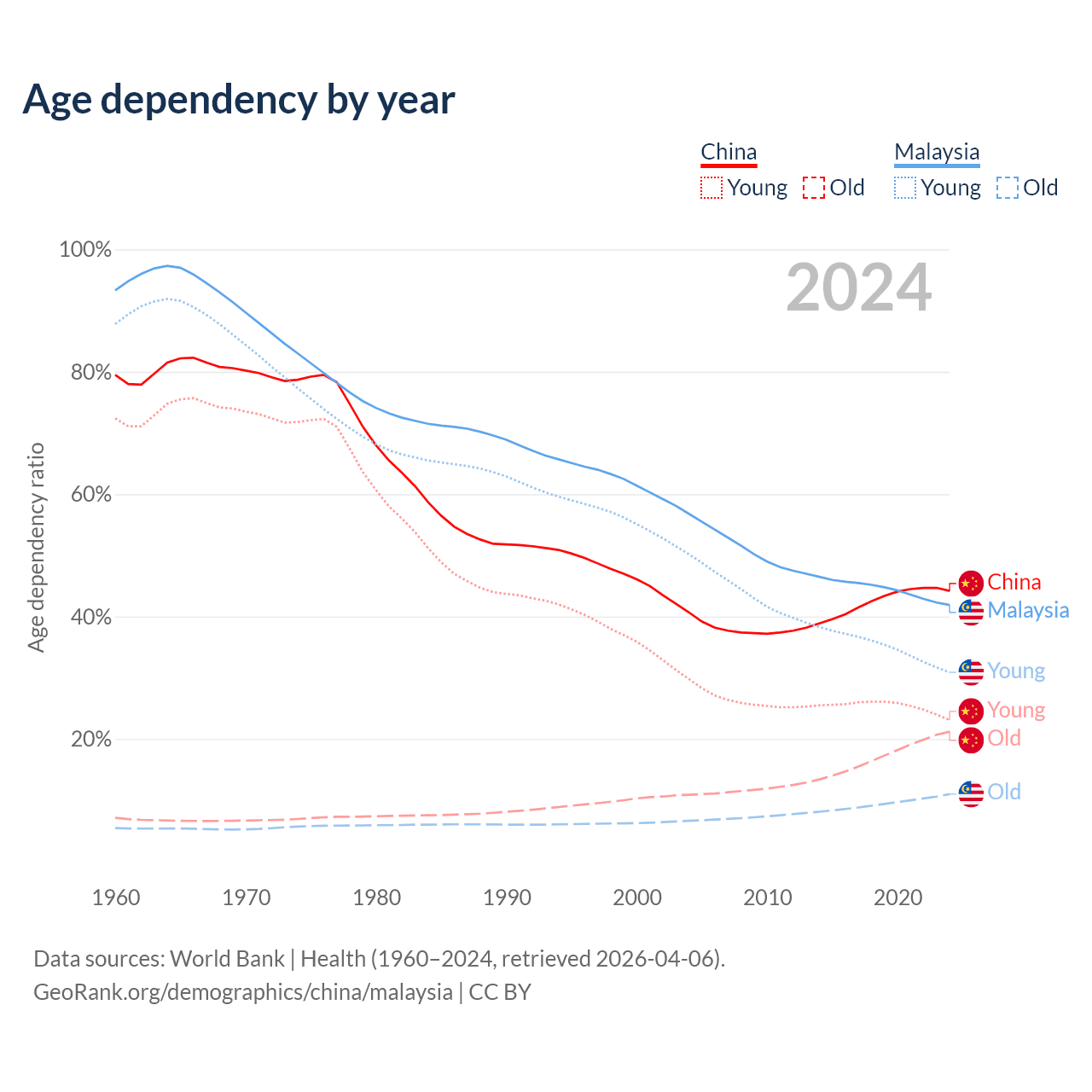 Data sources: World Bank | Health (1960–2024, retrieved 2026-04-06); U.S. Census Bureau (1960–2024, retrieved 2026-02-08).