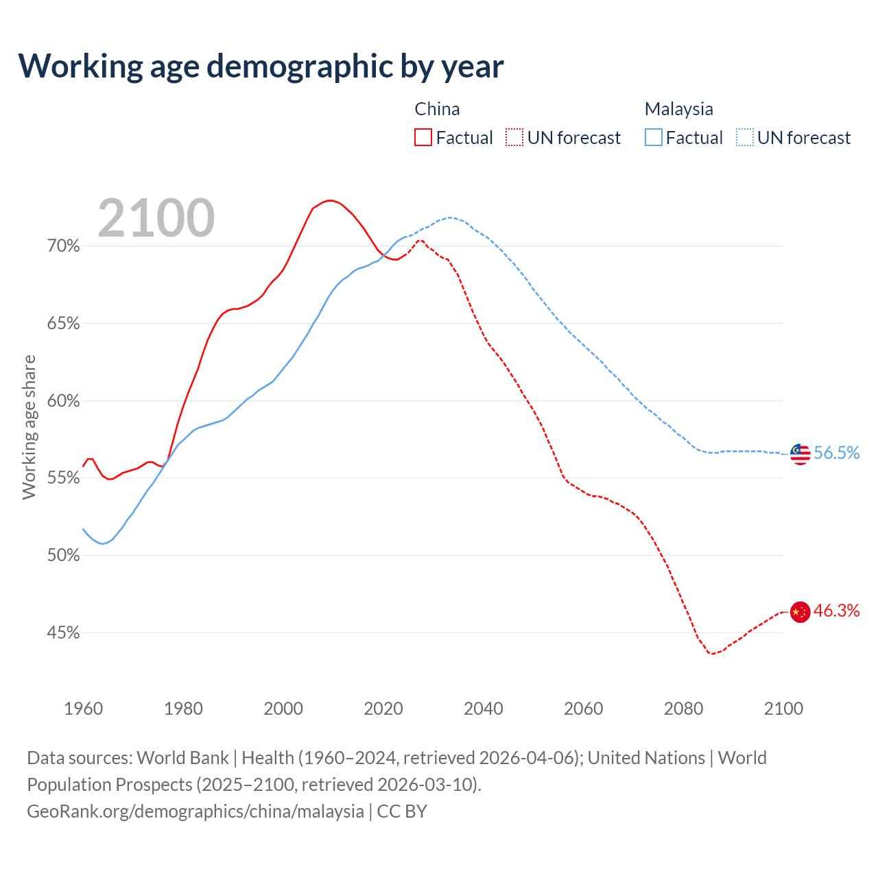 Median age China vs Malaysia, 1960-2100