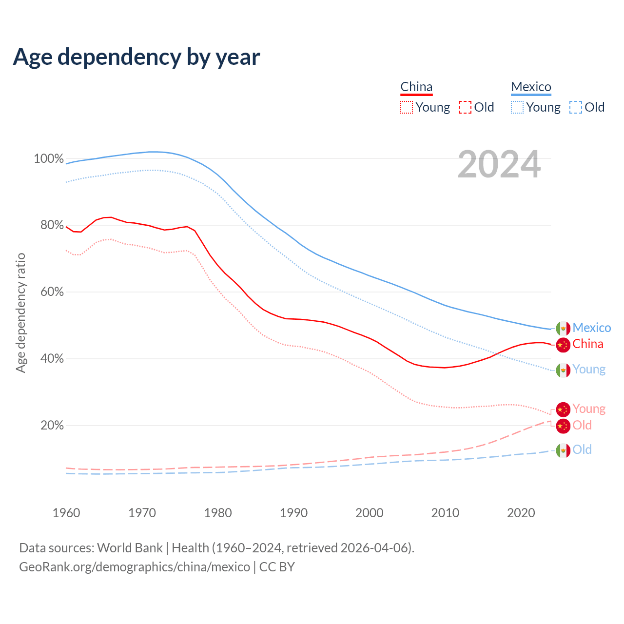 Data sources: World Bank | Health (1960–2024, retrieved 2026-04-06); U.S. Census Bureau (1960–2024, retrieved 2026-02-08).