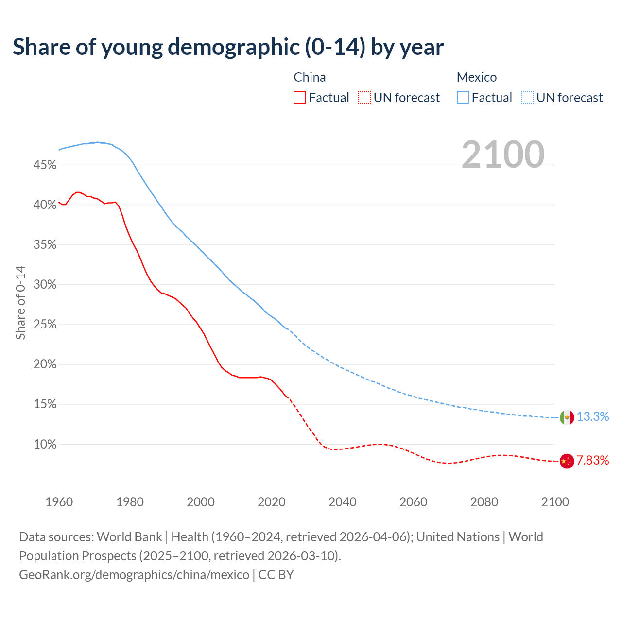 - As of 2026, the population of China is 1.4B vs 133M in Mexico - 10.5 times difference.