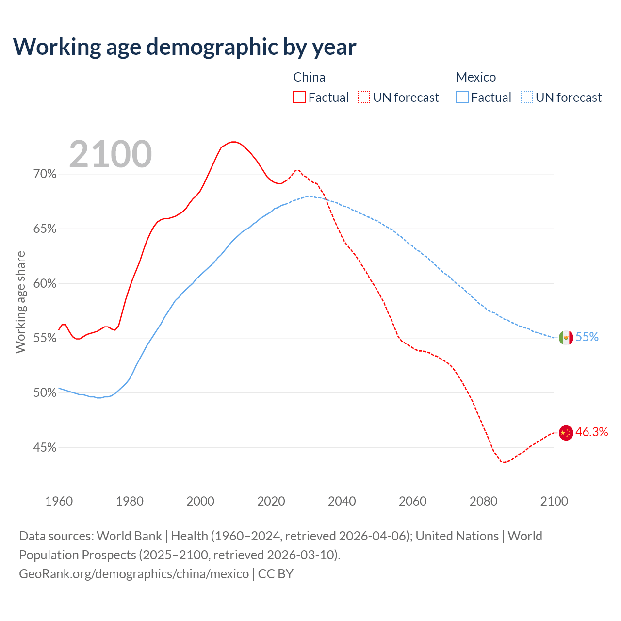 - China is ranked 44/196 by median age (oldest to youngest) vs 102/196 for Mexico.