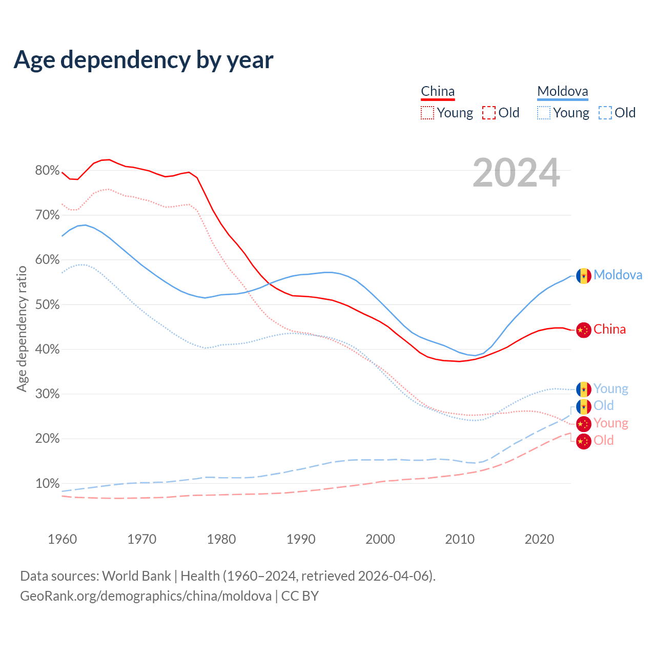 - The share of old-age demographic (65+) in China is 14.7% vs 16.2% in Moldova.