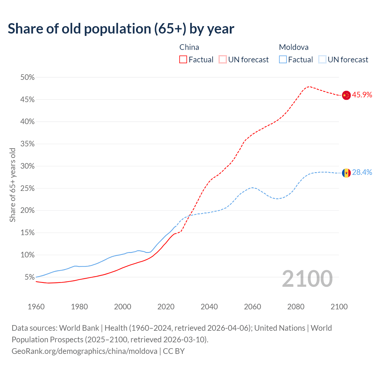 Median age China vs Moldova, 1960-2100
