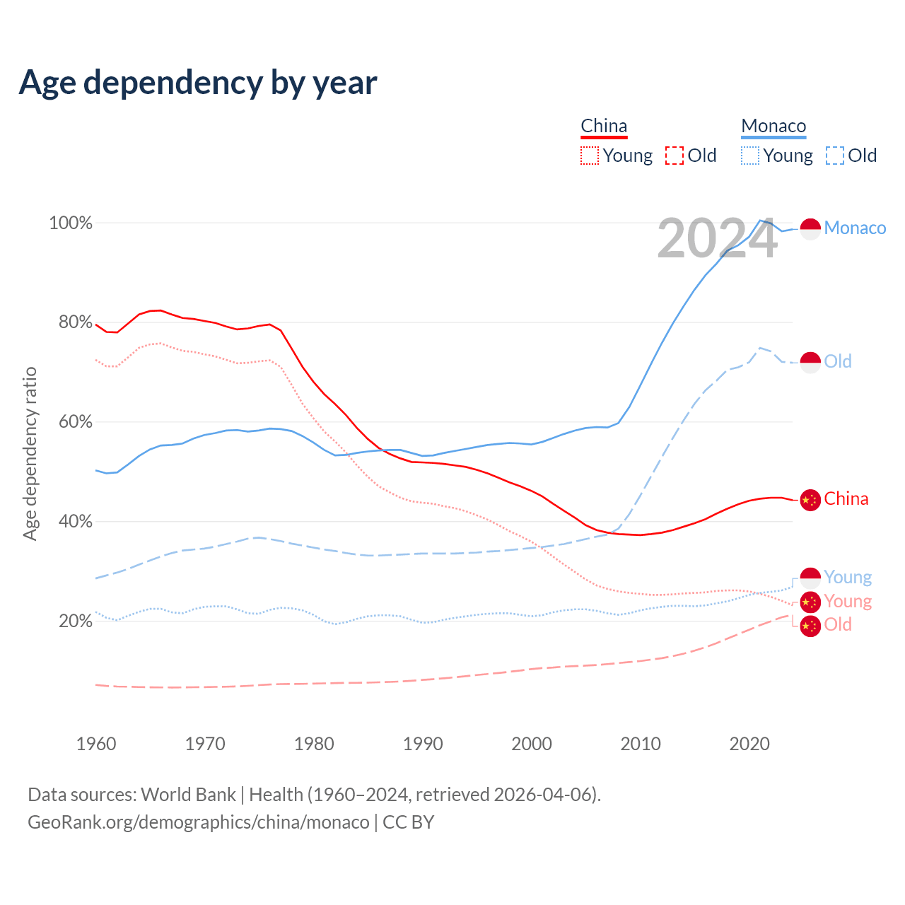 - China is ranked 44/196 by median age (oldest to youngest) vs 1/196 for Monaco.