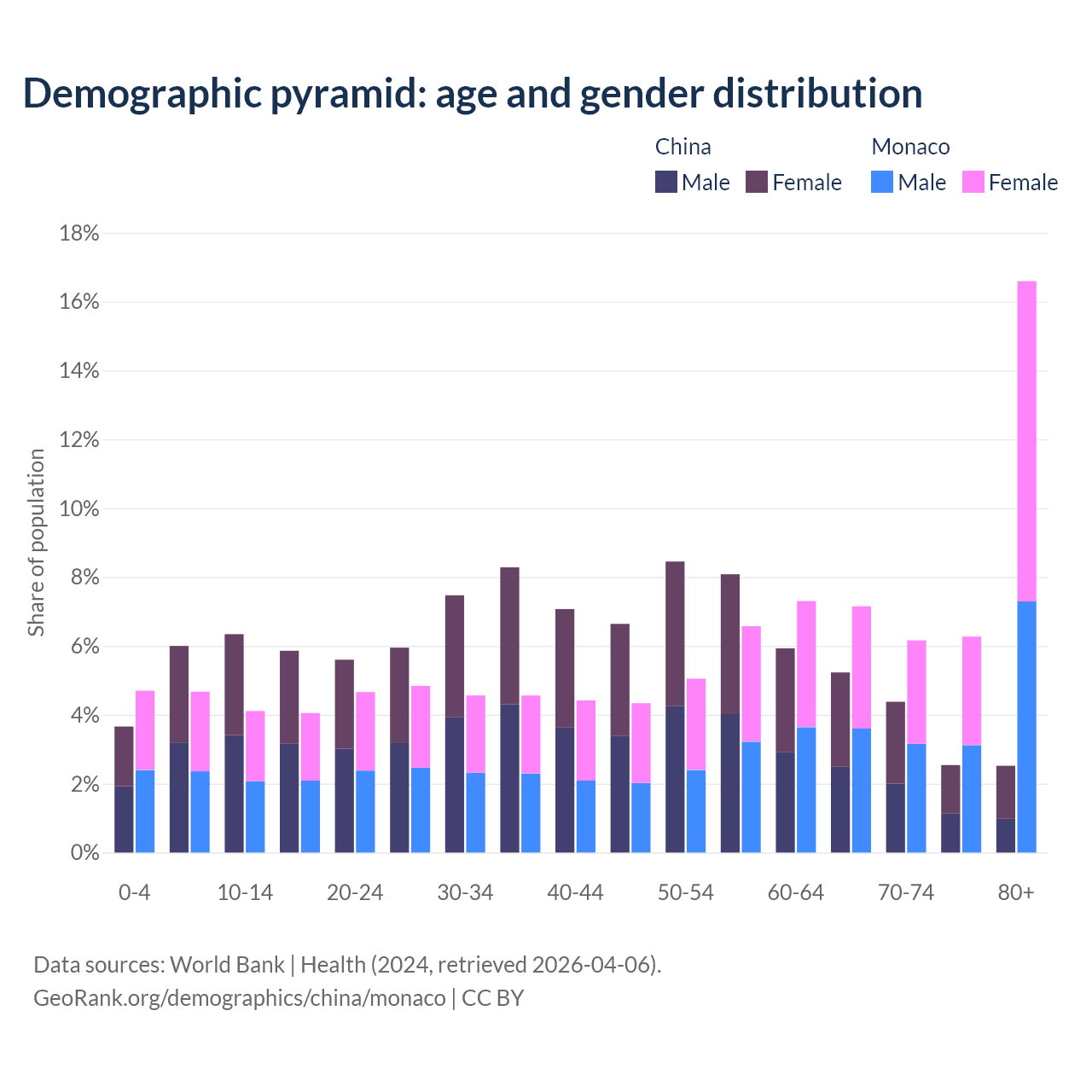 The share of older people aged 65 and over is 14.7% in China and 36.2% in Monaco. Life expectancy in China compared to Monaco .