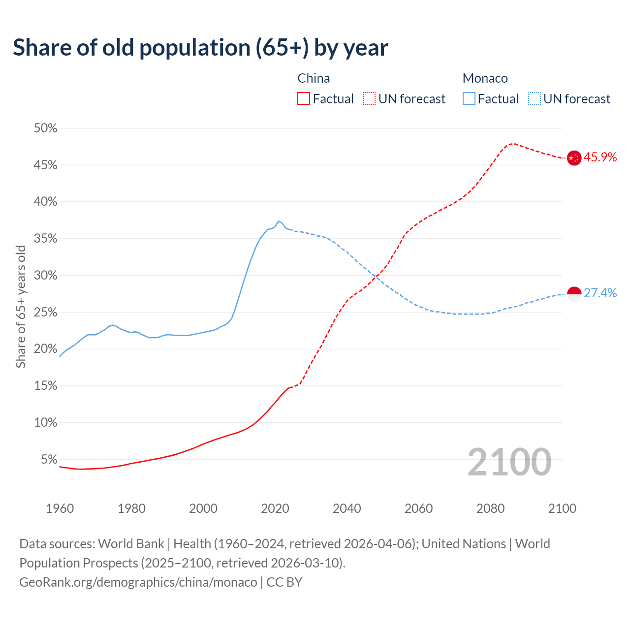 Median age China vs Monaco, 1960-2100