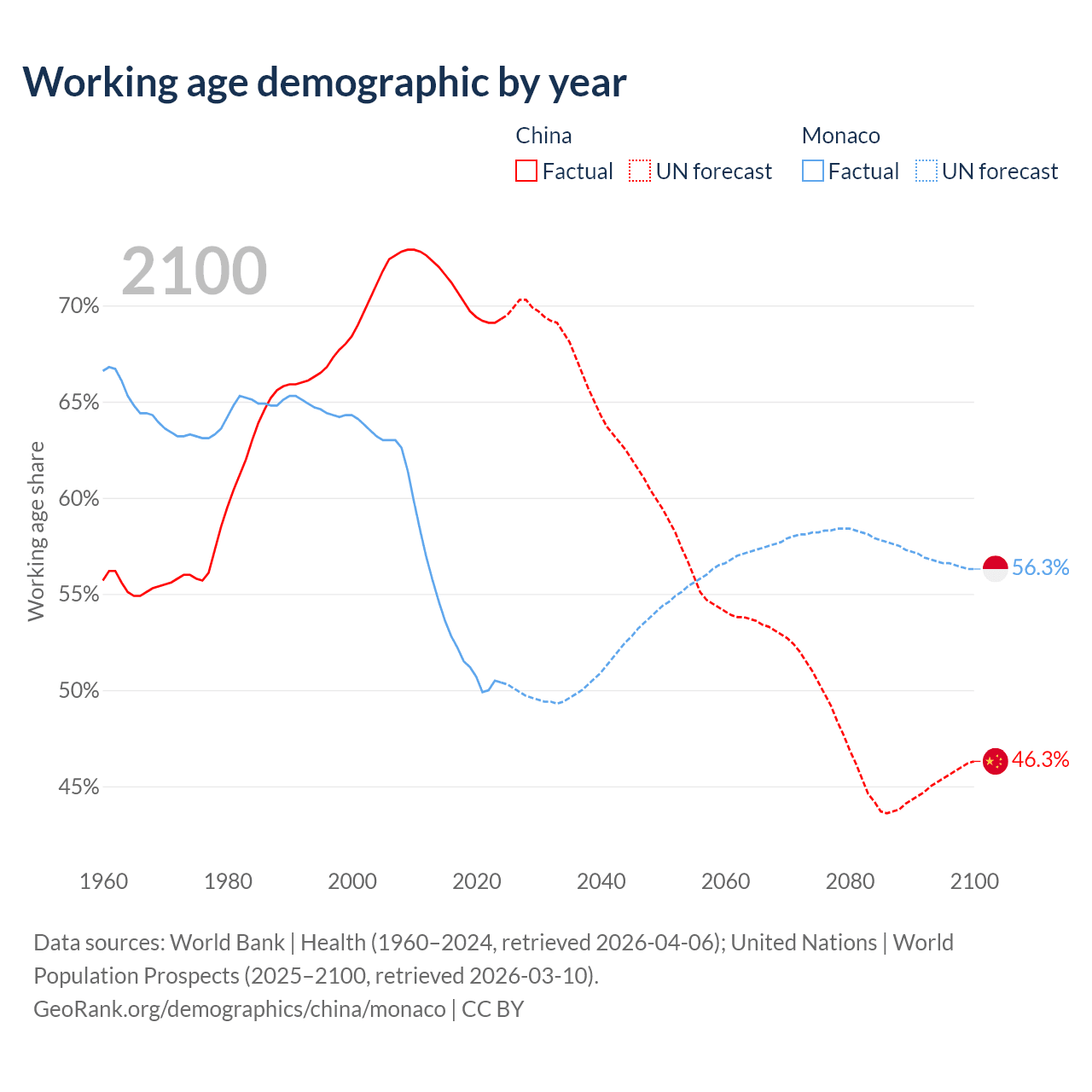- China has 972M working age adults (aged 15-64) vs 19.2K in Monaco.