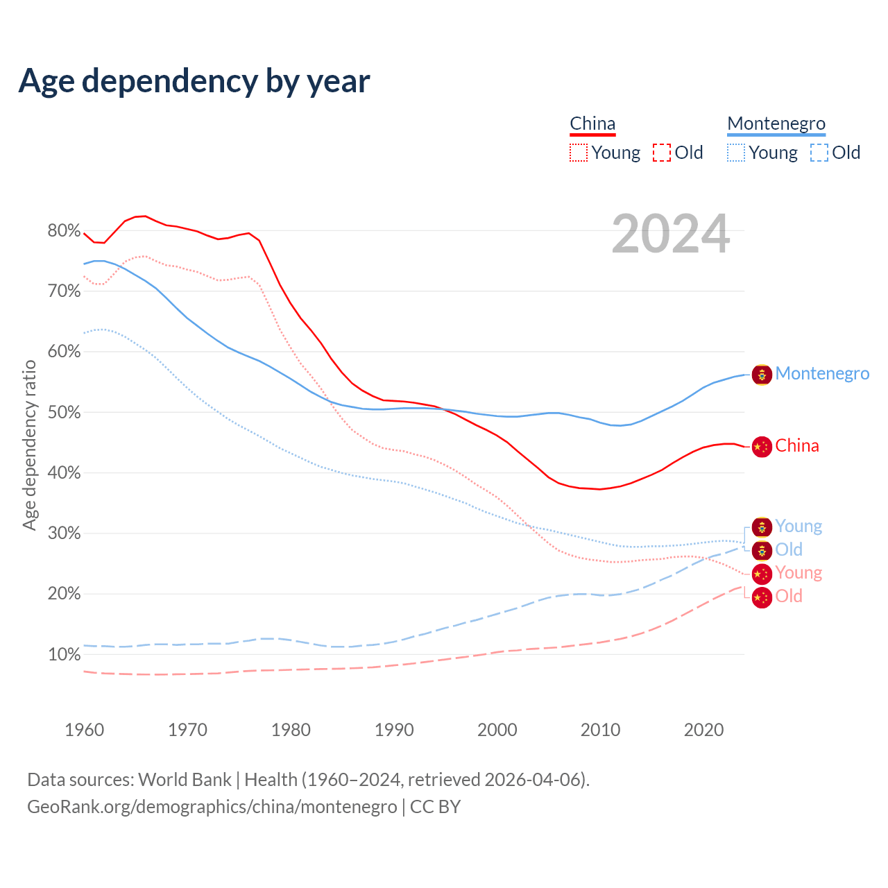 - China is ranked 44/196 by median age (oldest to youngest) vs 45/196 for Montenegro.