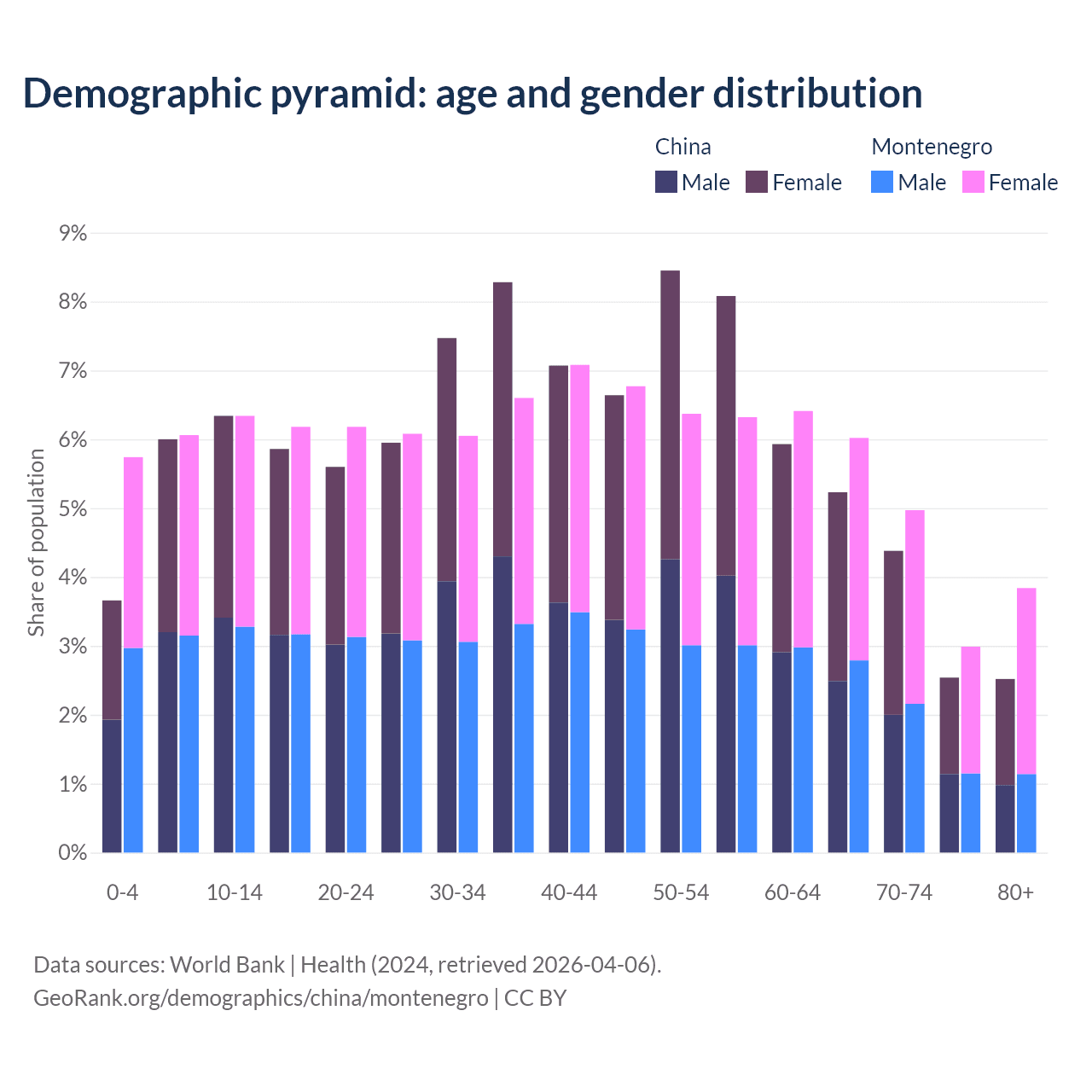 - As of 2026, the population of China is 1.4B vs 612K in Montenegro - 2,291 times difference.
