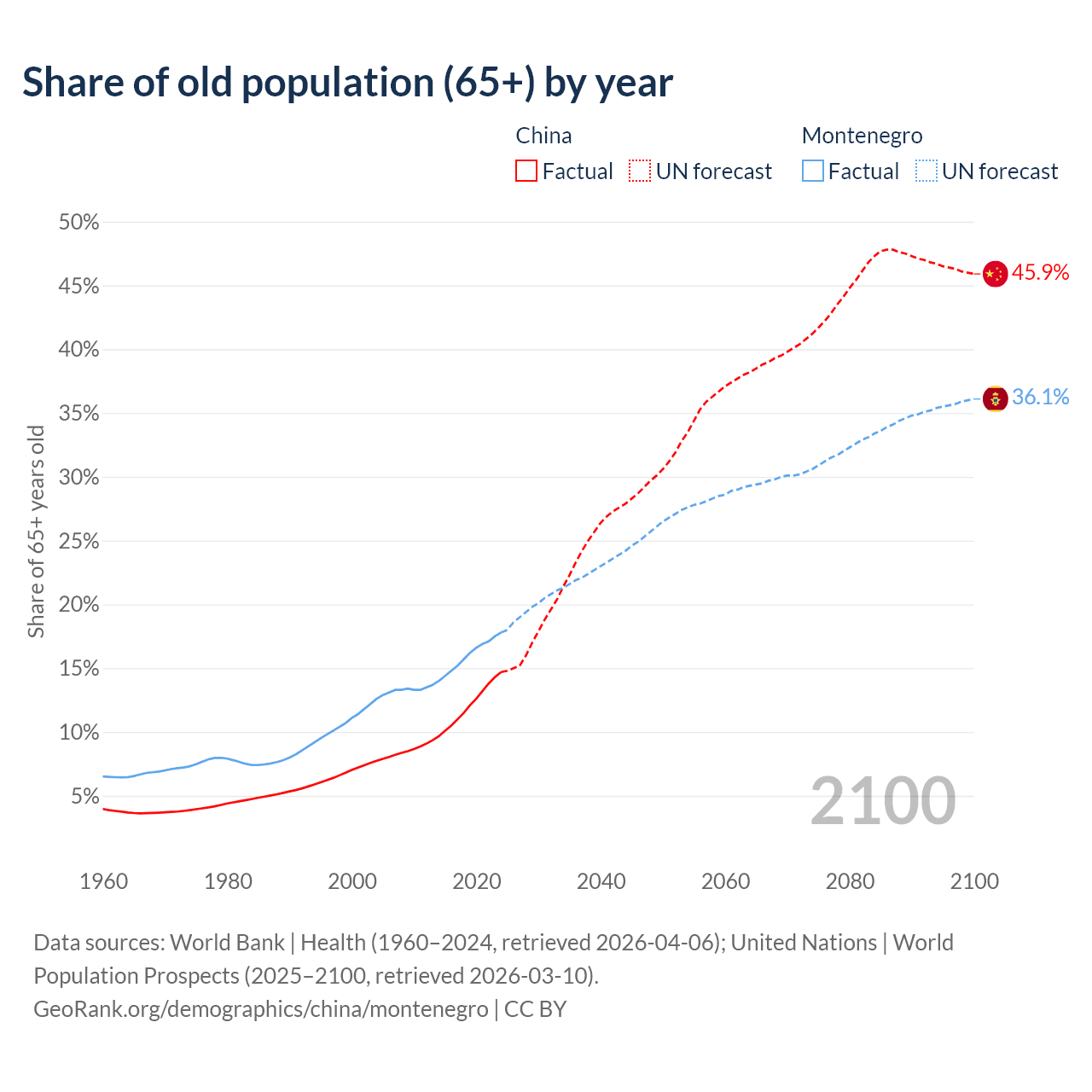 The share of older people aged 65 and over is 14.7% in China and 17.8% in Montenegro. Life expectancy in China compared to Montenegro .