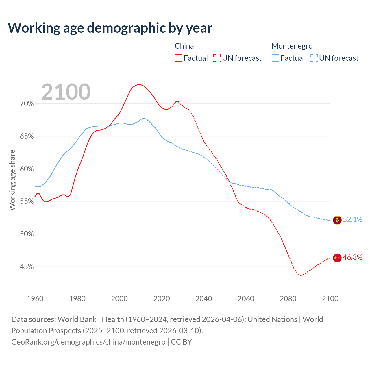 - China has 972M working age adults (aged 15-64) vs 392K in Montenegro.