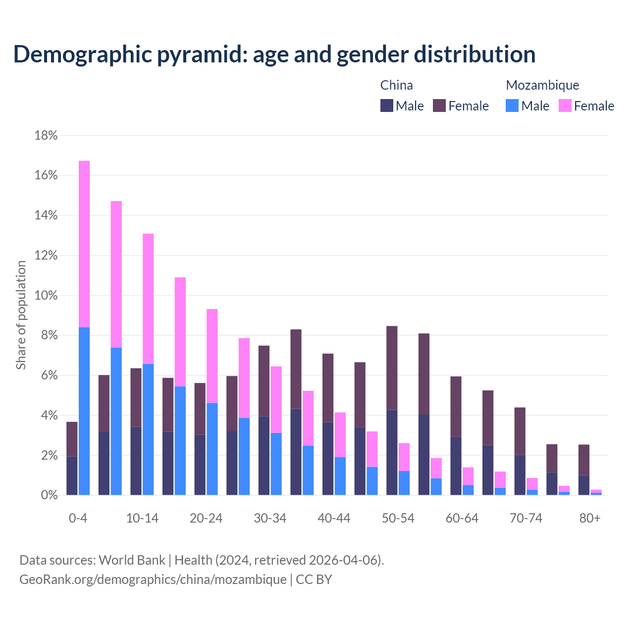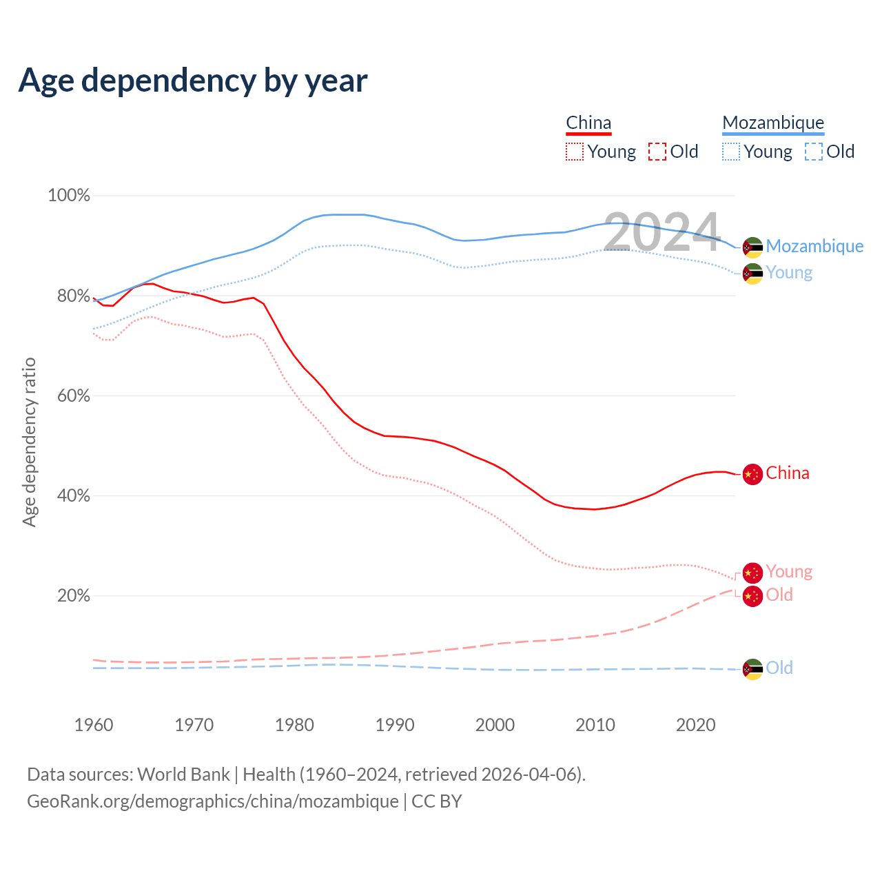 - China is ranked 44/196 by median age (oldest to youngest) vs 189/196 for Mozambique.