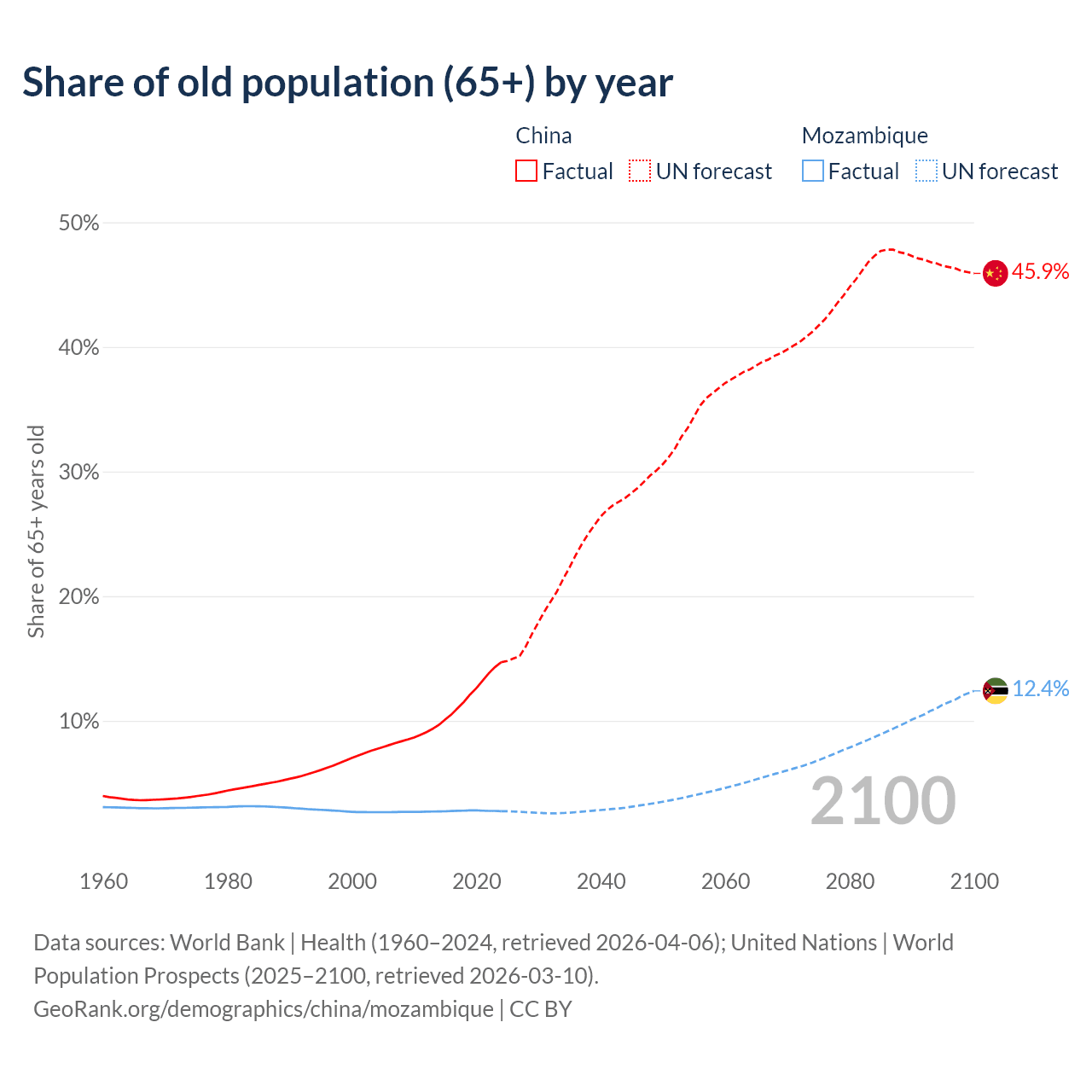 The share of older people aged 65 and over is 14.7% in China and 2.75% in Mozambique. Life expectancy in China compared to Mozambique .