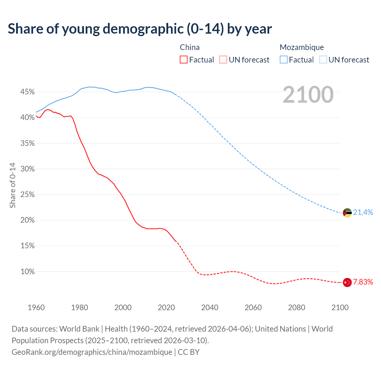 - The share of young demographic (0-15 years old) in China is 16% vs 44.5% in Mozambique.