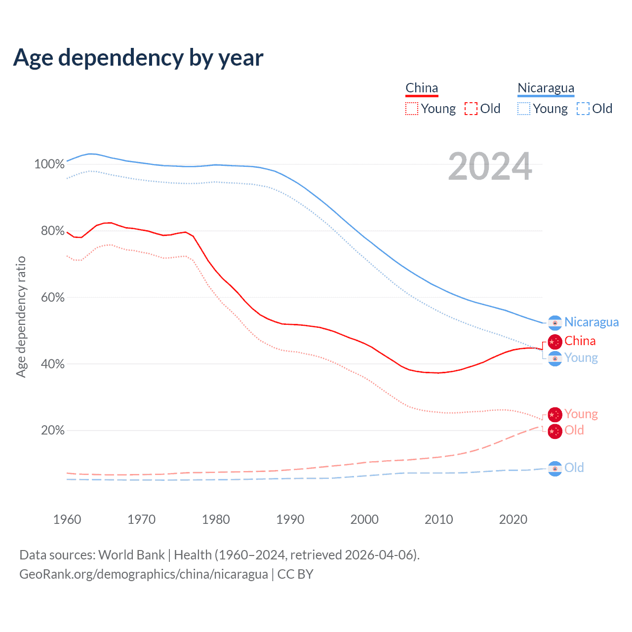 Data sources: World Bank | Health (1960–2024, retrieved 2026-04-06); U.S. Census Bureau (1960–2024, retrieved 2026-02-08).