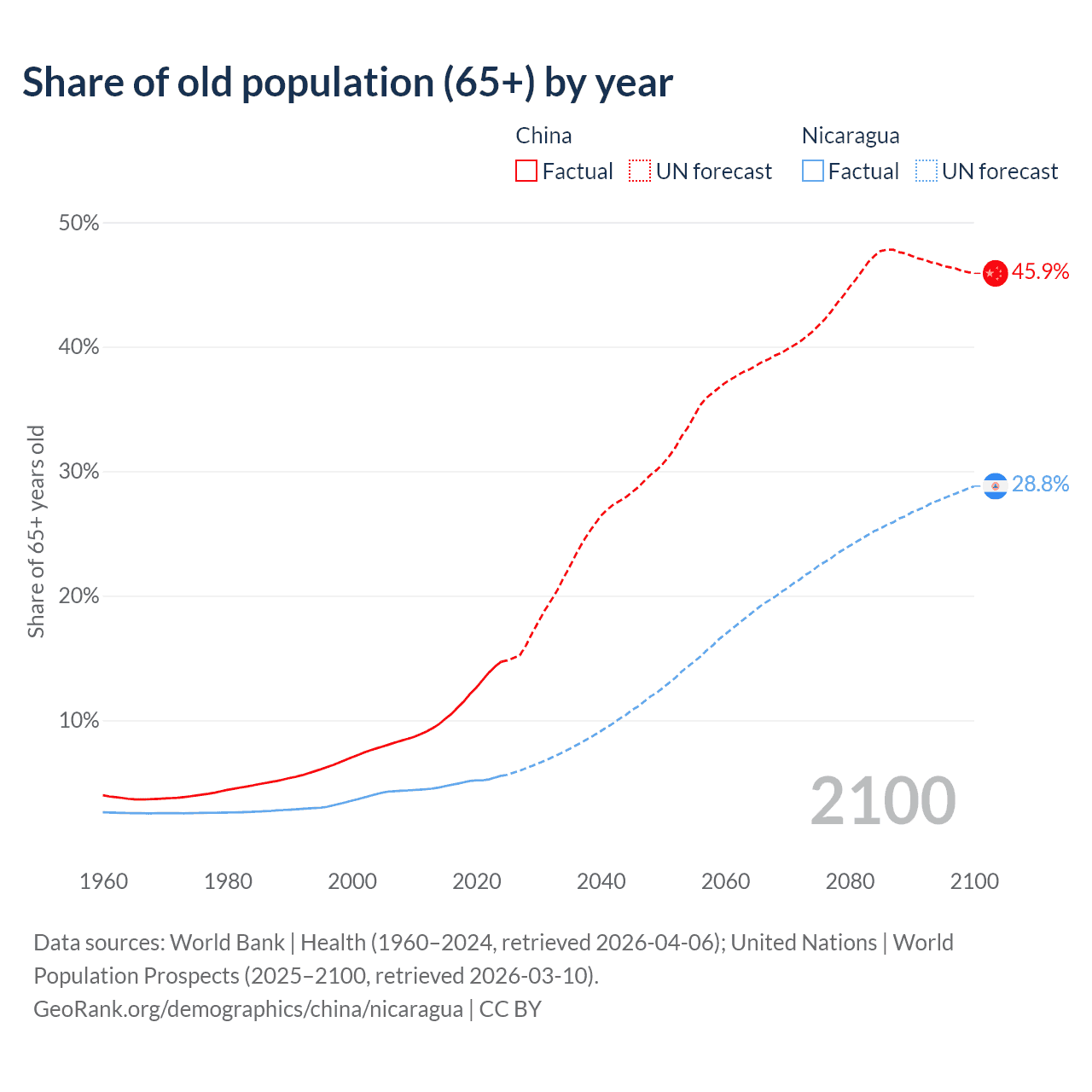 The share of older people aged 65 and over is 14.7% in China and 5.53% in Nicaragua. Life expectancy in China compared to Nicaragua .