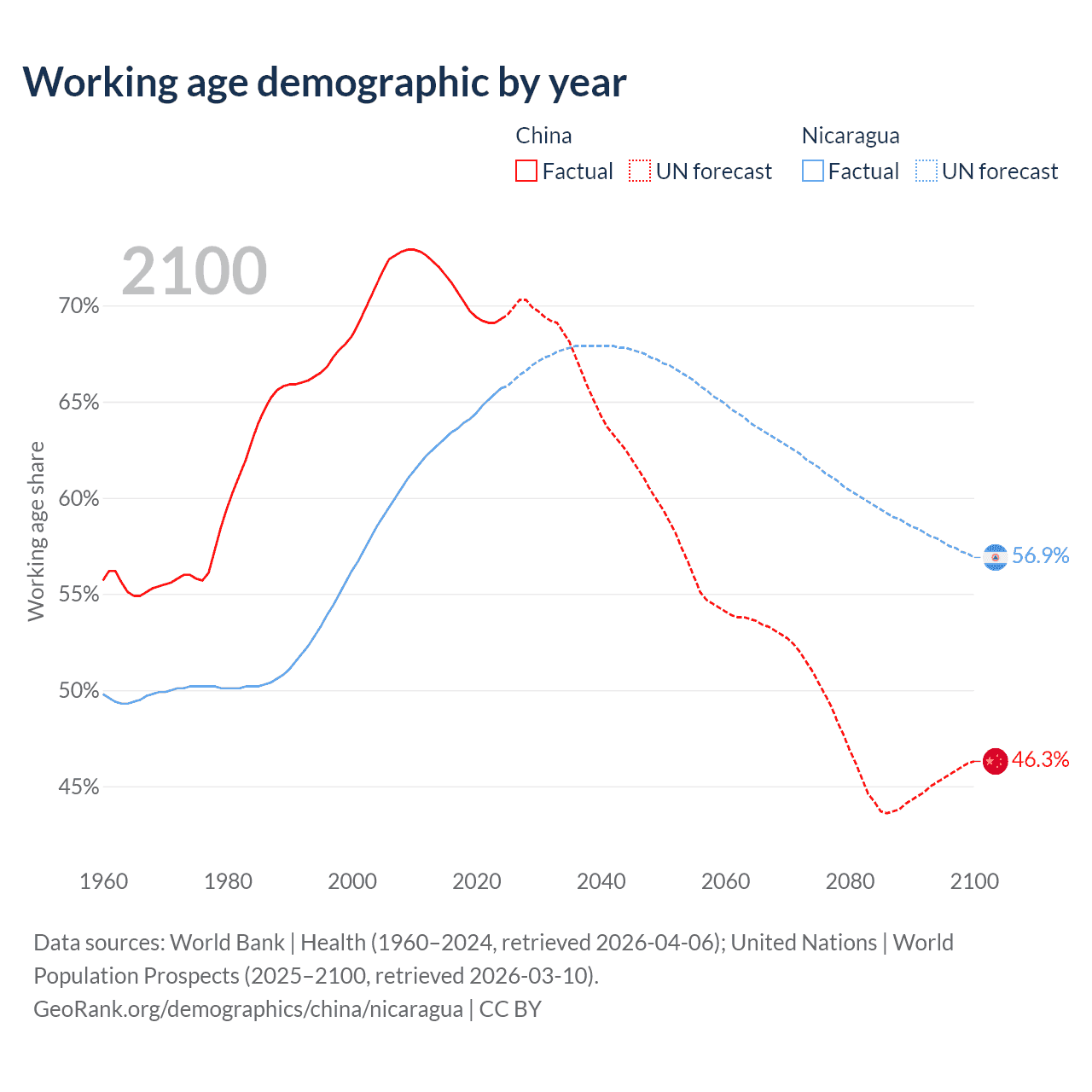 Median age China vs Nicaragua, 1960-2100