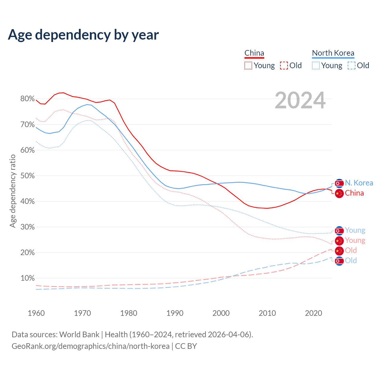 - China is ranked 44/196 by median age (oldest to youngest) vs 62/196 for North Korea.