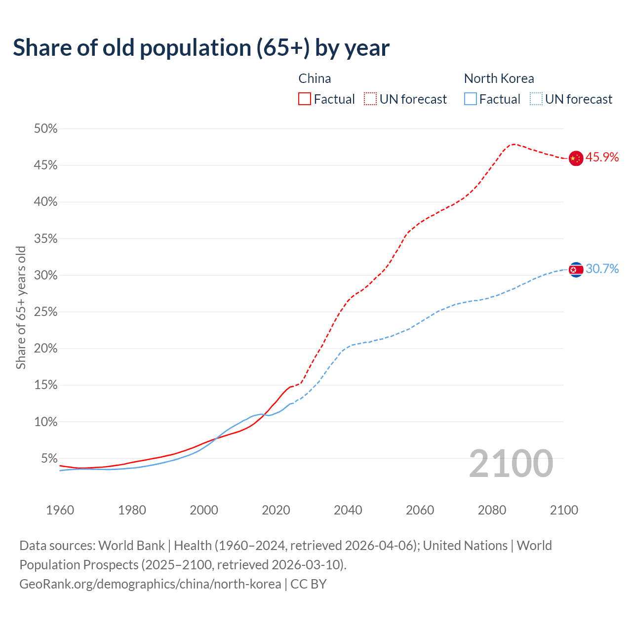 The share of older people aged 65 and over is 14.7% in China and 12.4% in North Korea. Life expectancy in China compared to North Korea .