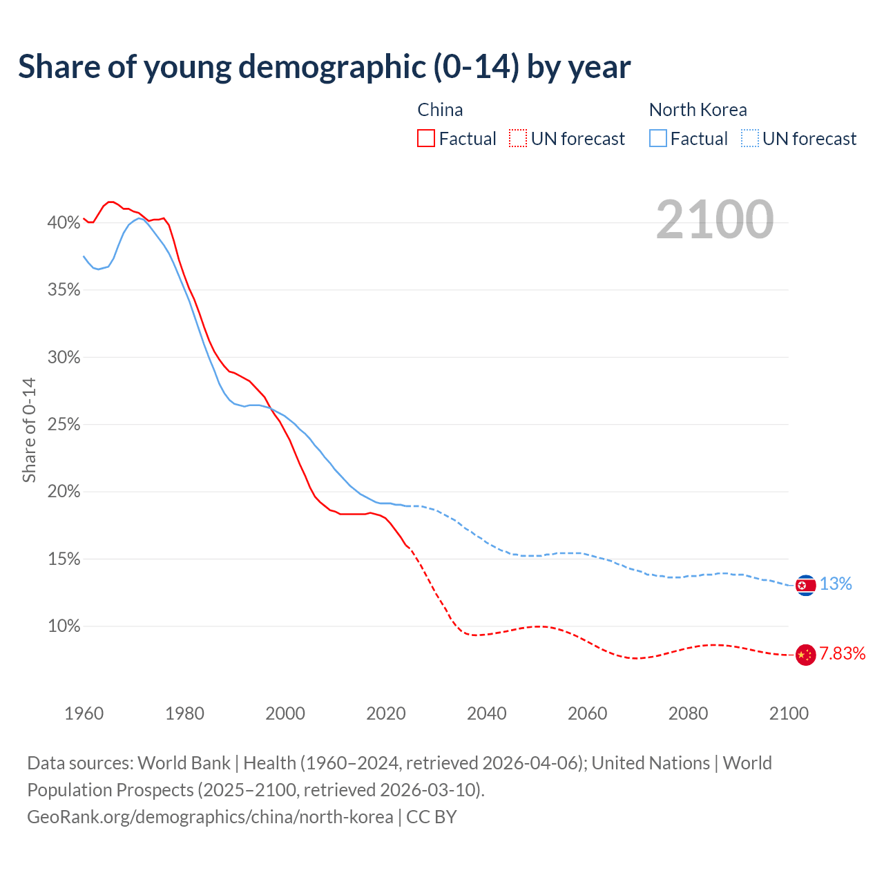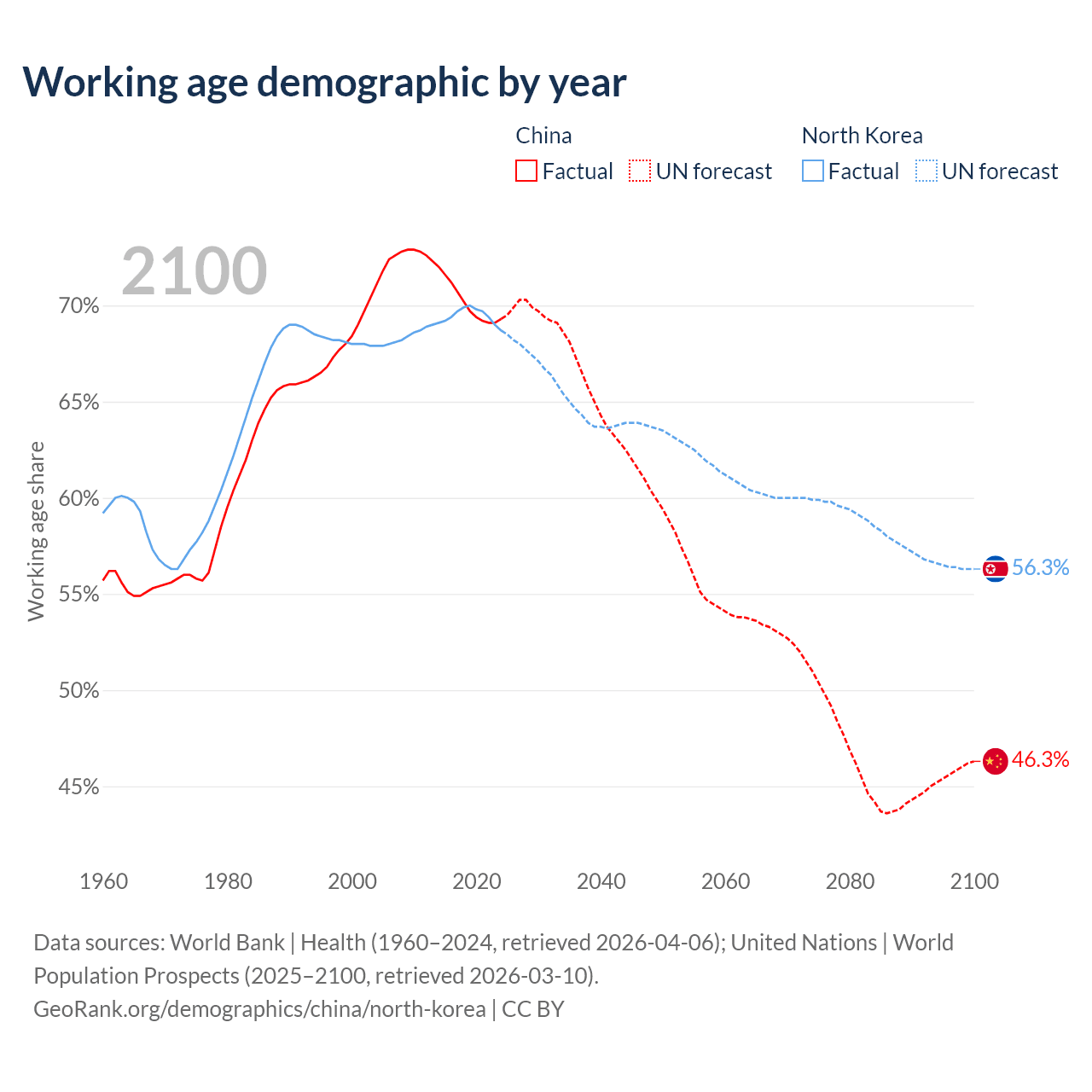 Median age China vs North Korea, 1960-2100