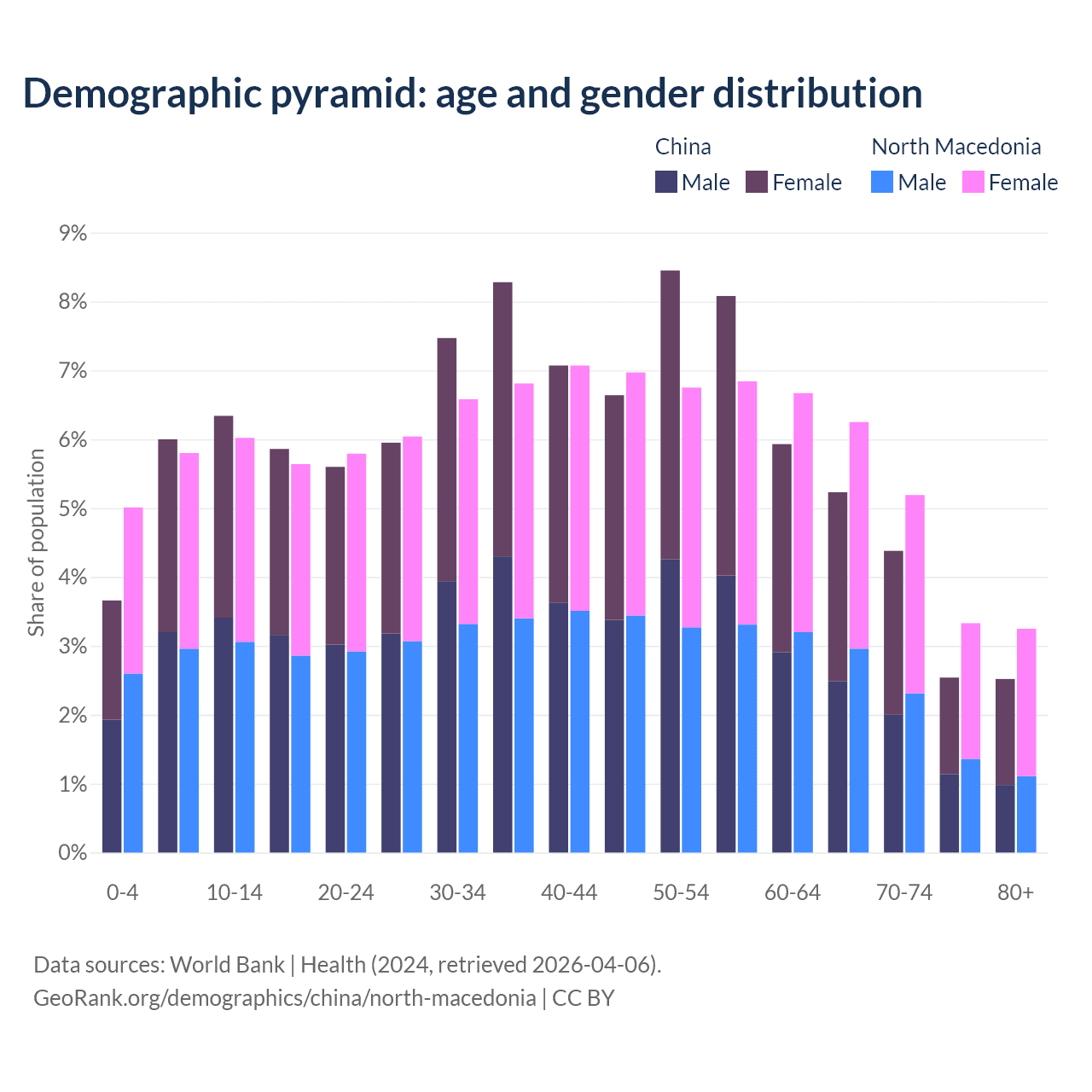 - China is ranked 44/196 by median age (oldest to youngest) vs 37/196 for North Macedonia.
