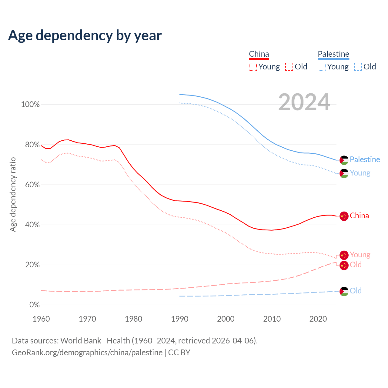 - China is ranked 44/196 by median age (oldest to youngest) vs 157/196 for Palestine.