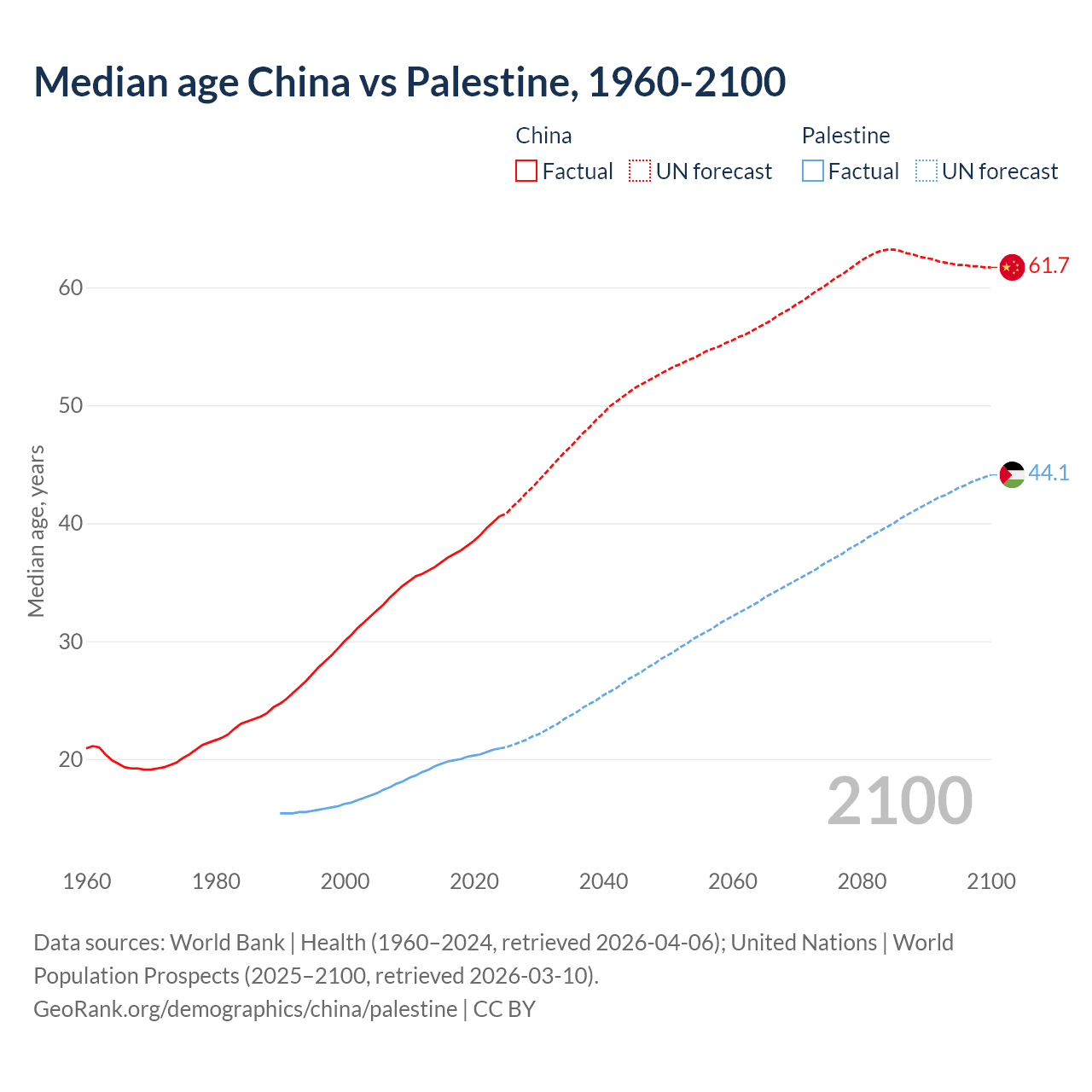 Median age China vs Palestine, 1960-2100