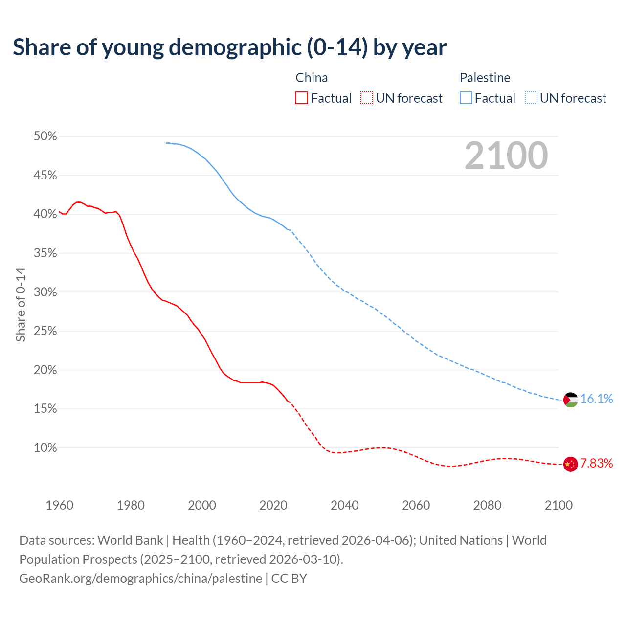 - The share of young demographic (0-15 years old) in China is 16% vs 38% in Palestine.