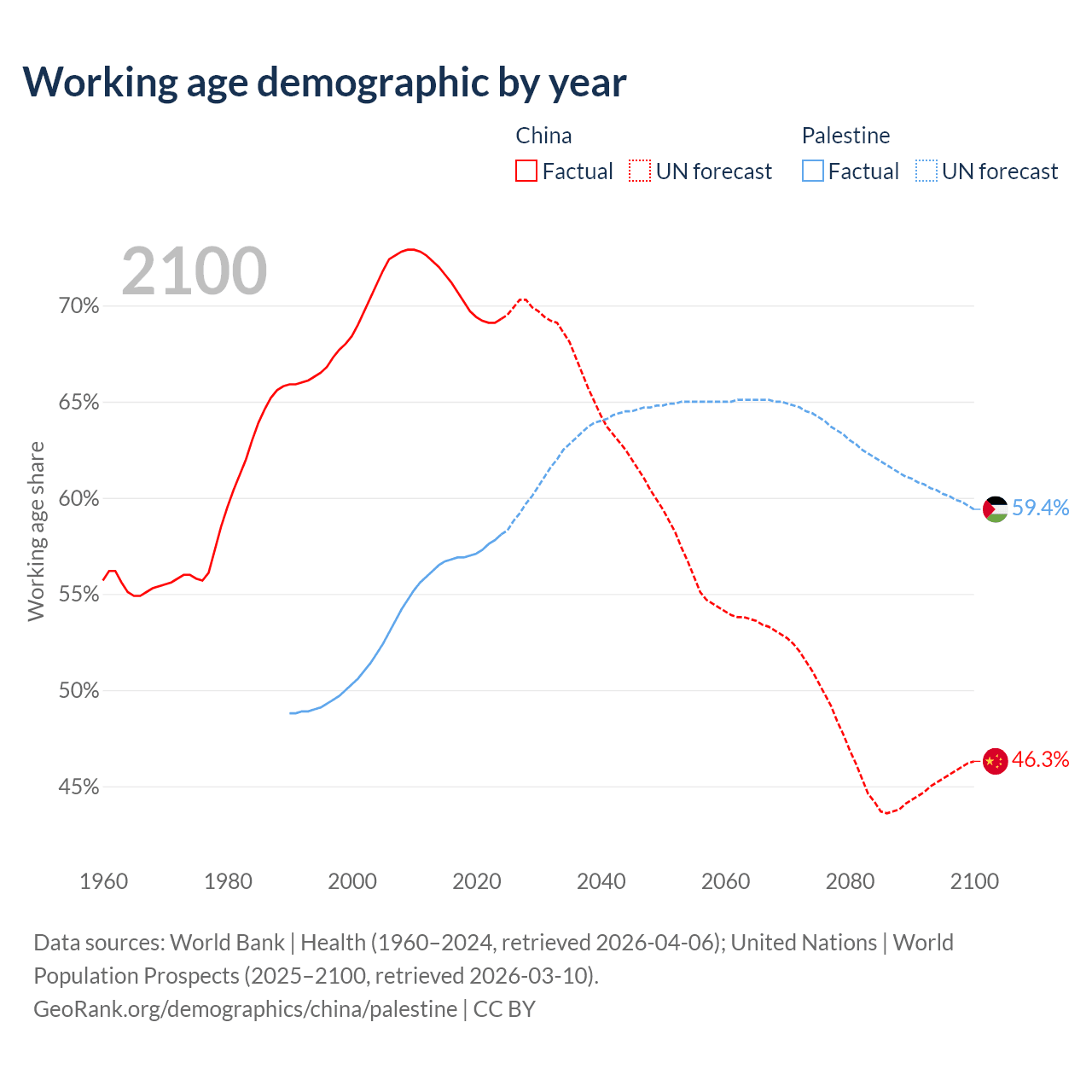 - China has 972M working age adults (aged 15-64) vs 3.2M in Palestine.