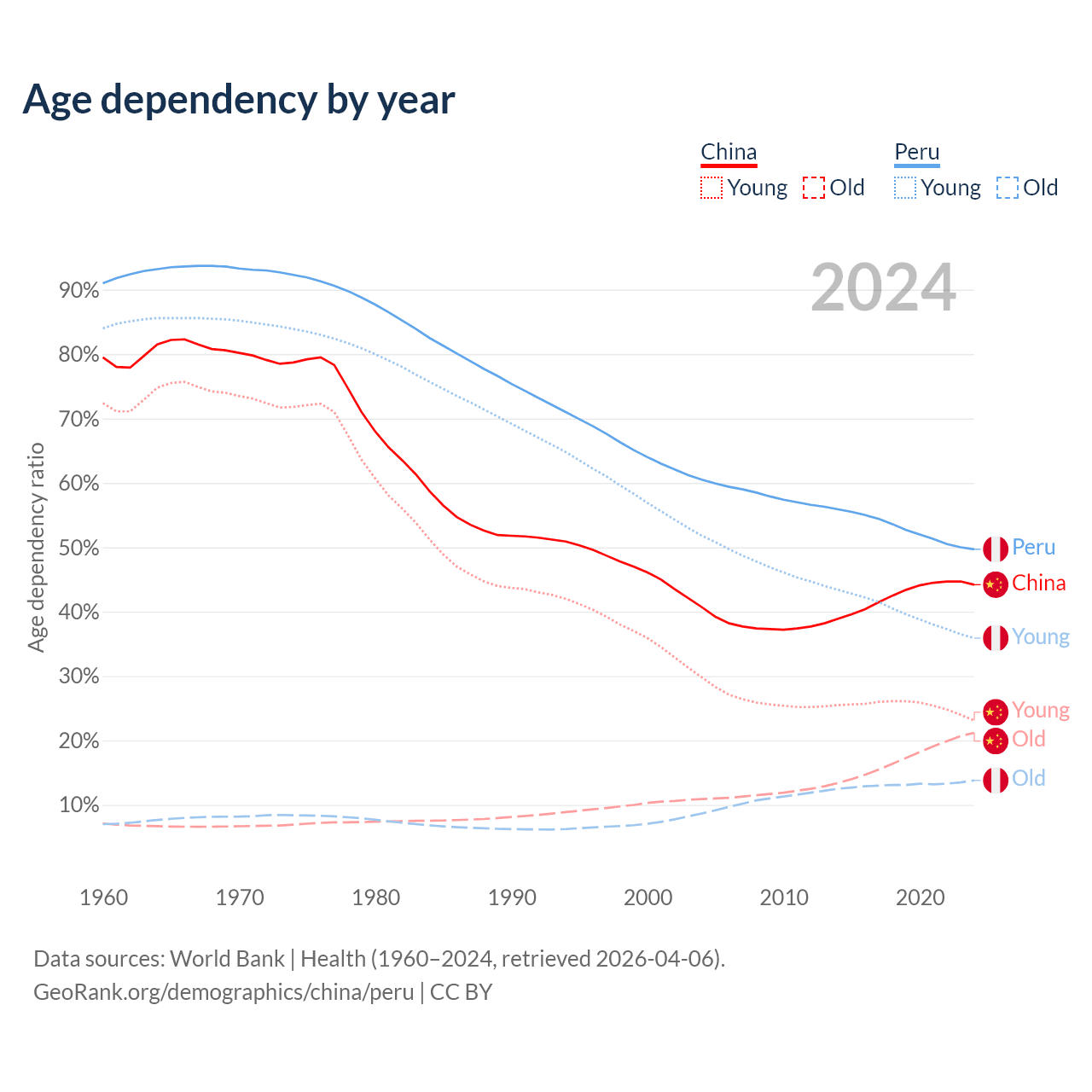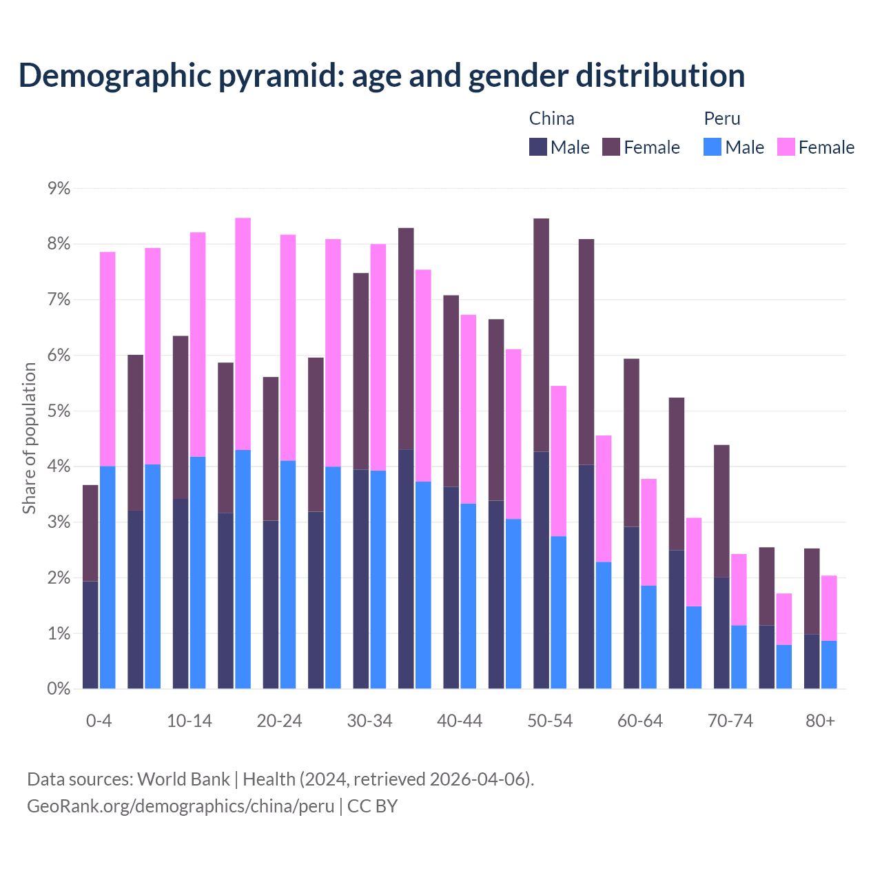 - China is ranked 44/196 by median age (oldest to youngest) vs 97/196 for Peru.
