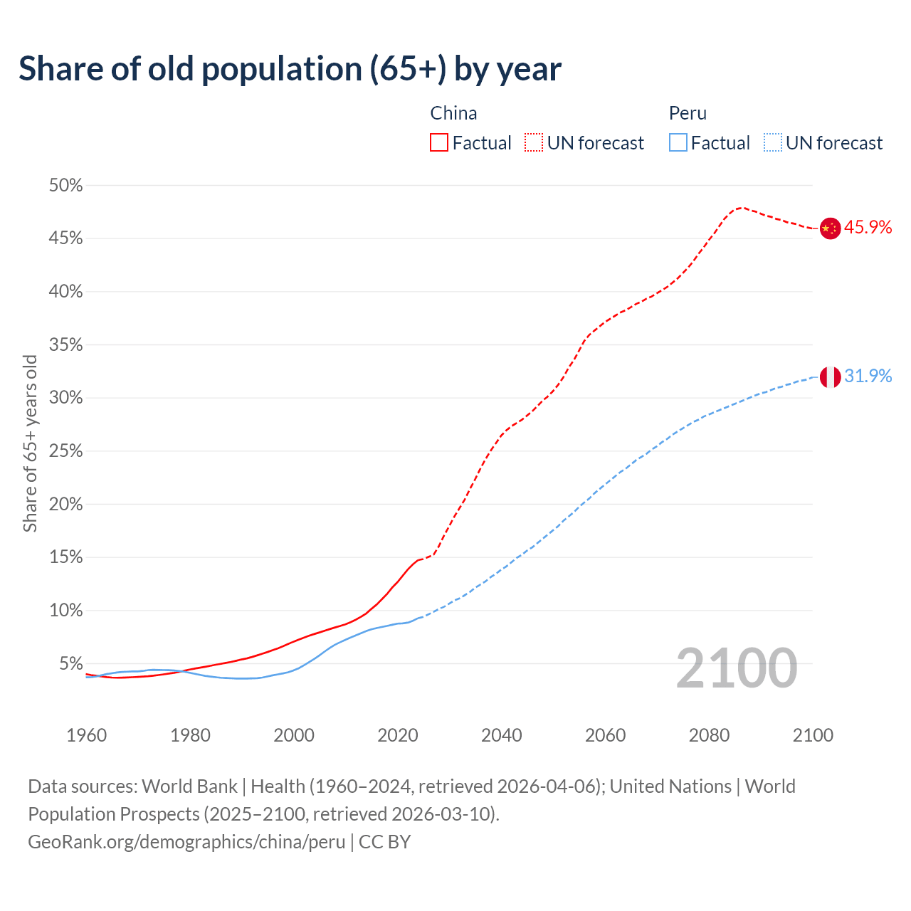 The share of older people aged 65 and over is 14.7% in China and 9.23% in Peru. Life expectancy in China compared to Peru .