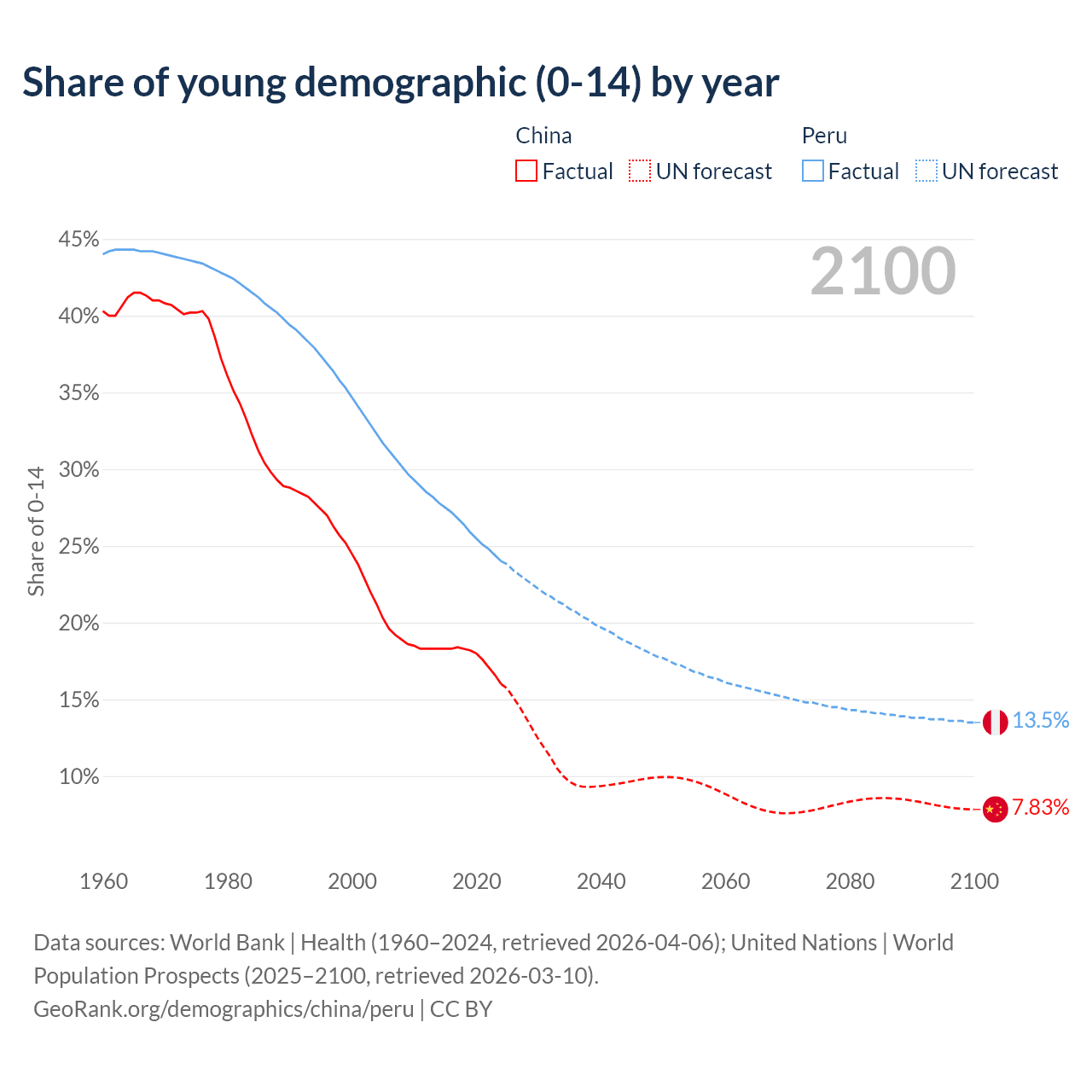 - The share of young demographic (0-15 years old) in China is 16% vs 24% in Peru.