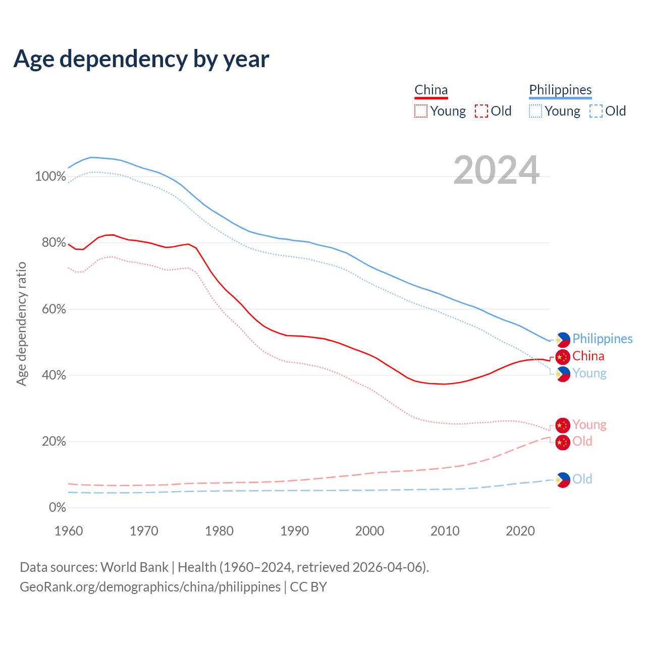 - China is ranked 44/196 by median age (oldest to youngest) vs 123/196 for the Philippines.