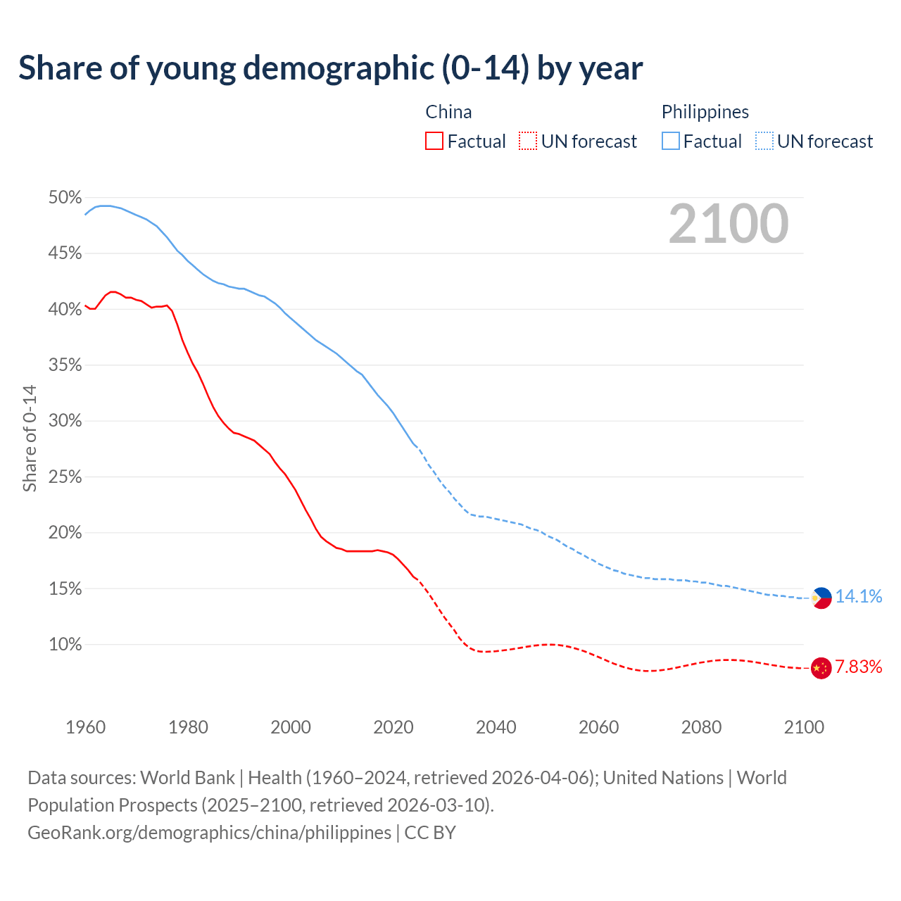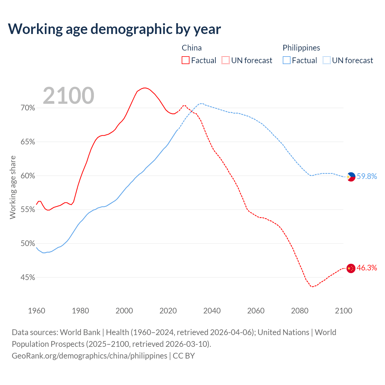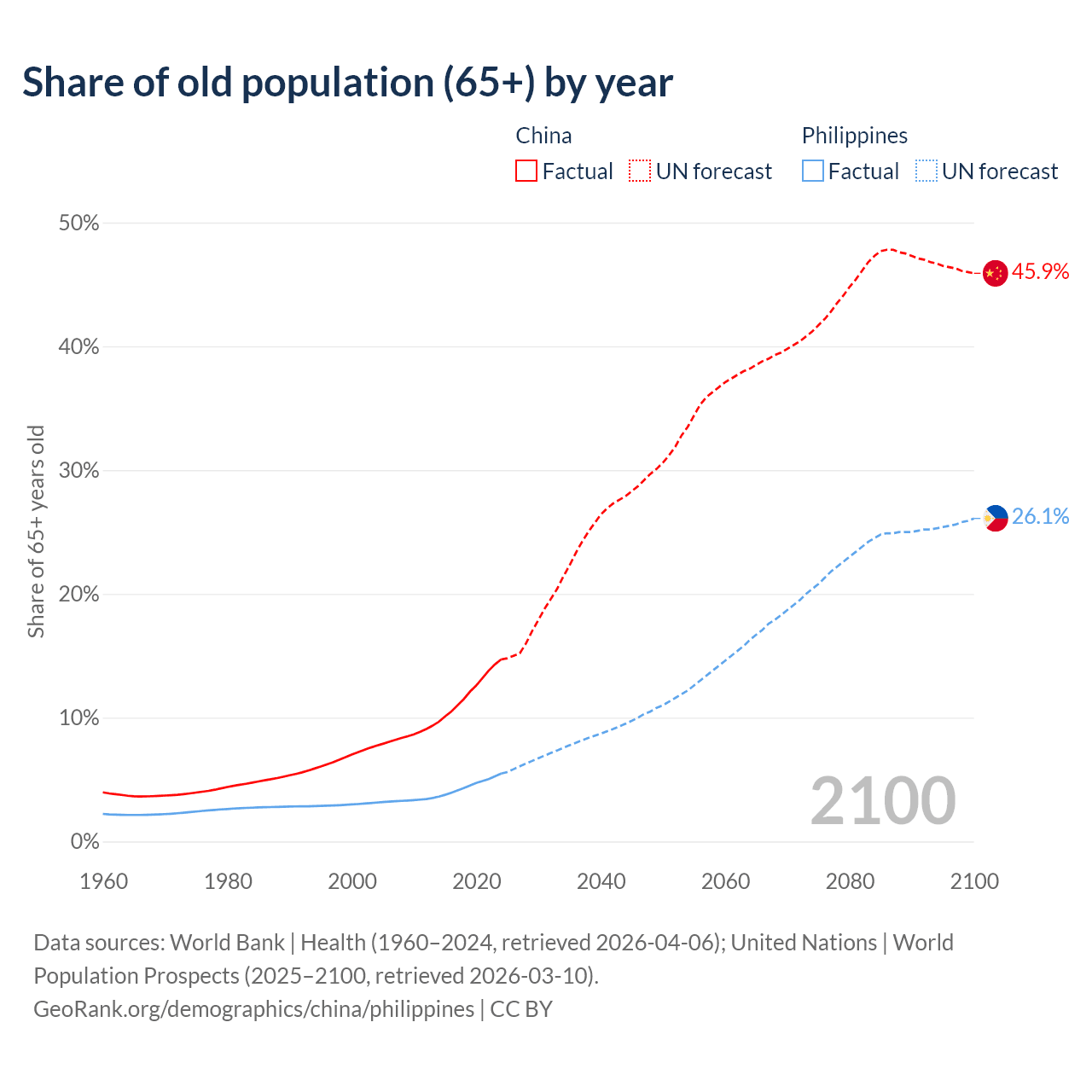 Median age China vs Philippines, 1960-2100
