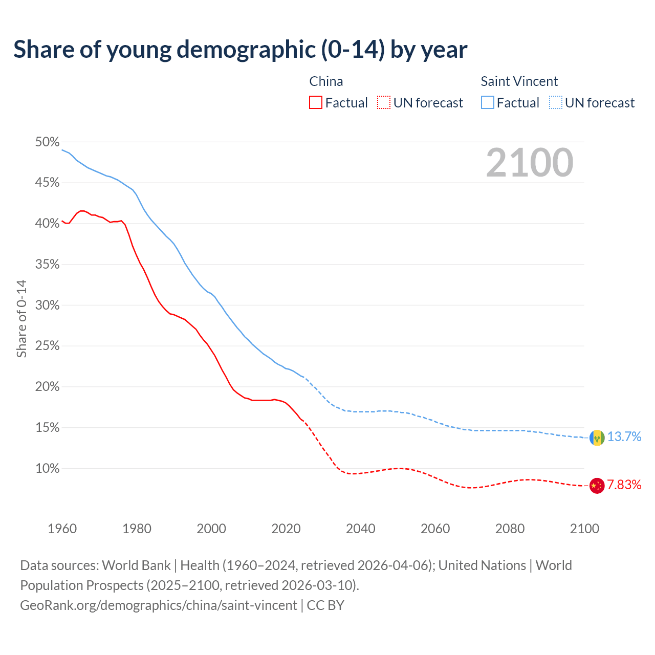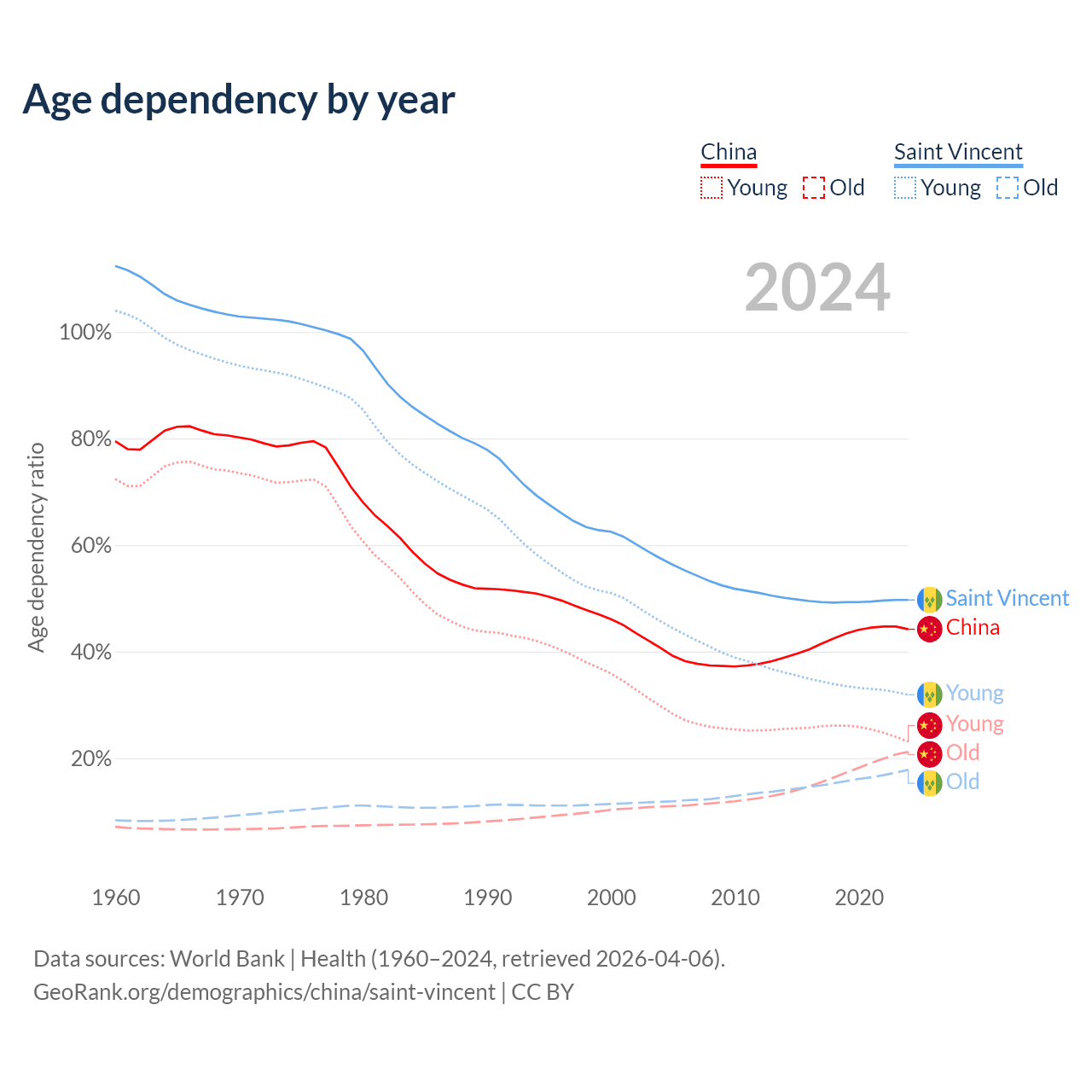 - The share of young demographic (0-15 years old) in China is 16% vs 21.3% in Saint Vincent.