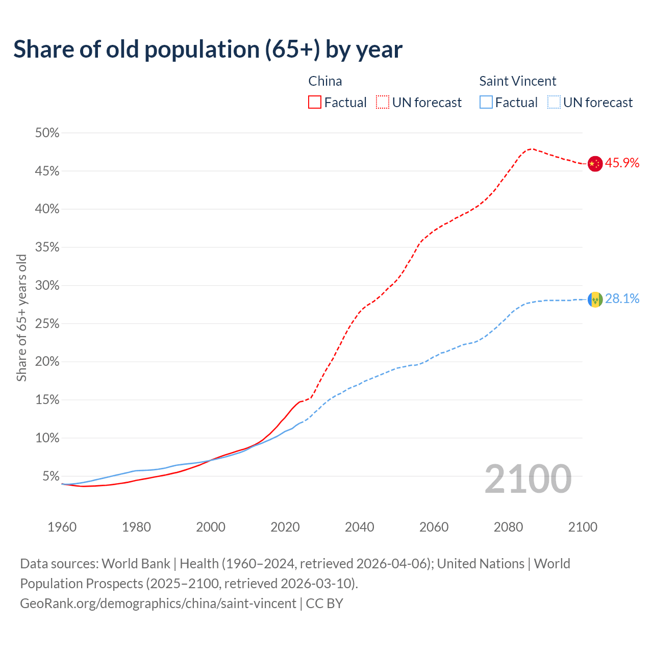 The share of older people aged 65 and over is 14.7% in China and 11.9% in Saint Vincent. Life expectancy in China compared to Saint Vincent .