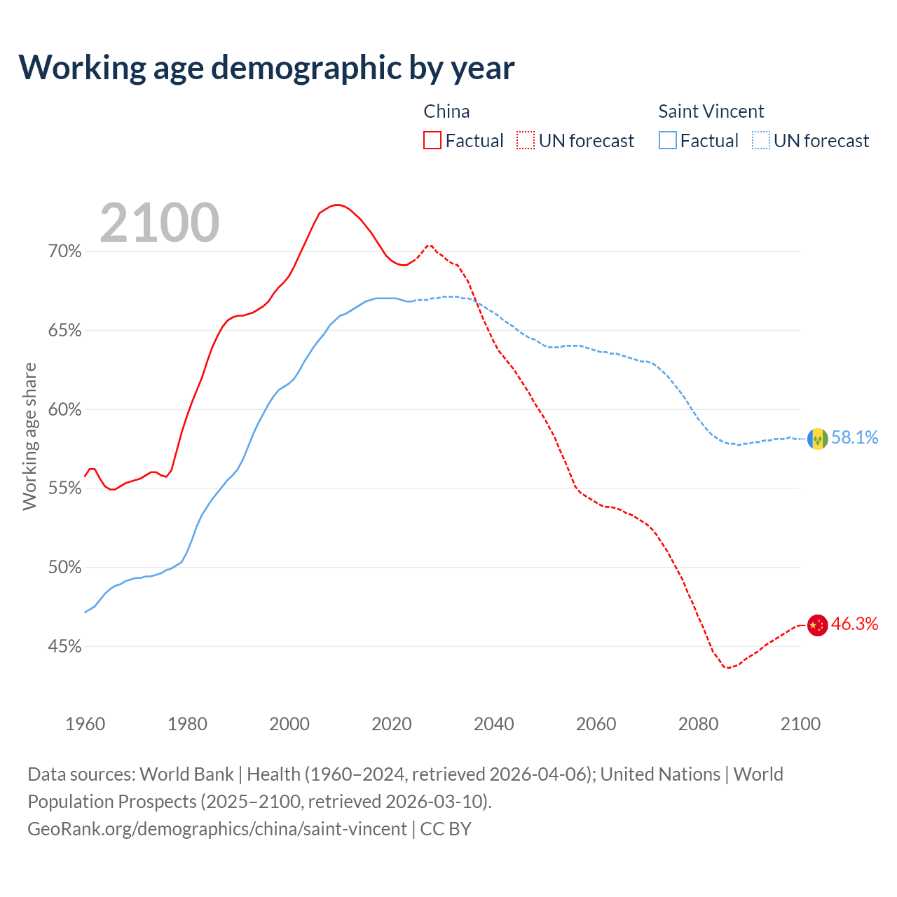 - China has 972M working age adults (aged 15-64) vs 66.3K in Saint Vincent.