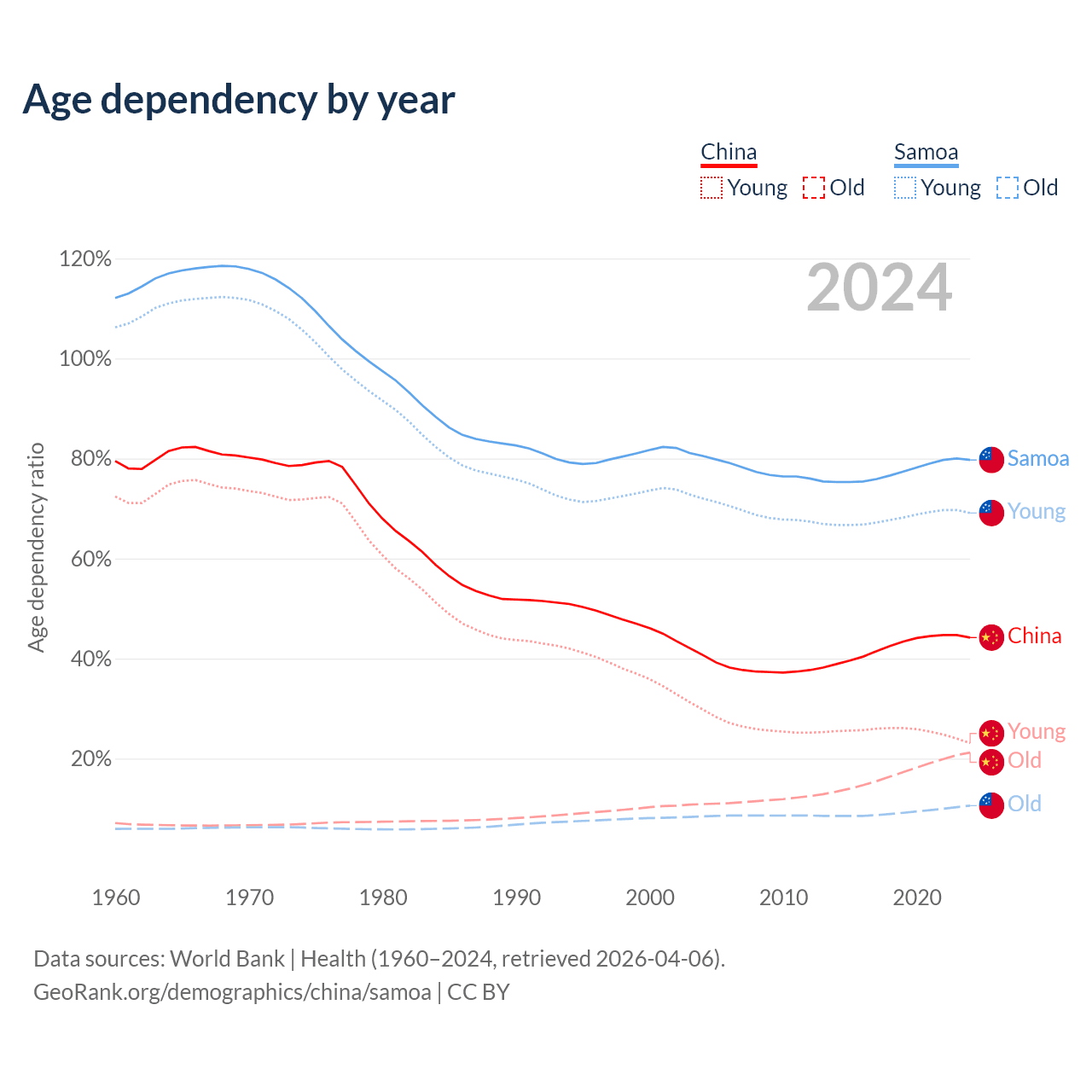 - China is ranked 44/196 by median age (oldest to youngest) vs 158/196 for Samoa.