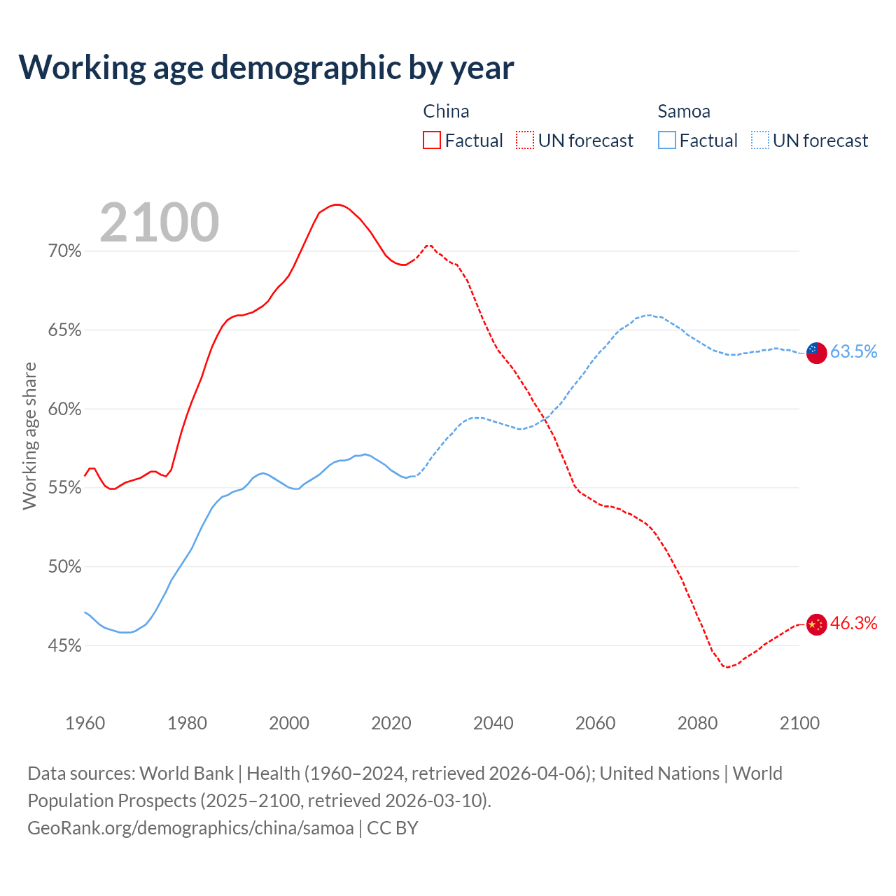 - China has 972M working age adults (aged 15-64) vs 123K in Samoa.