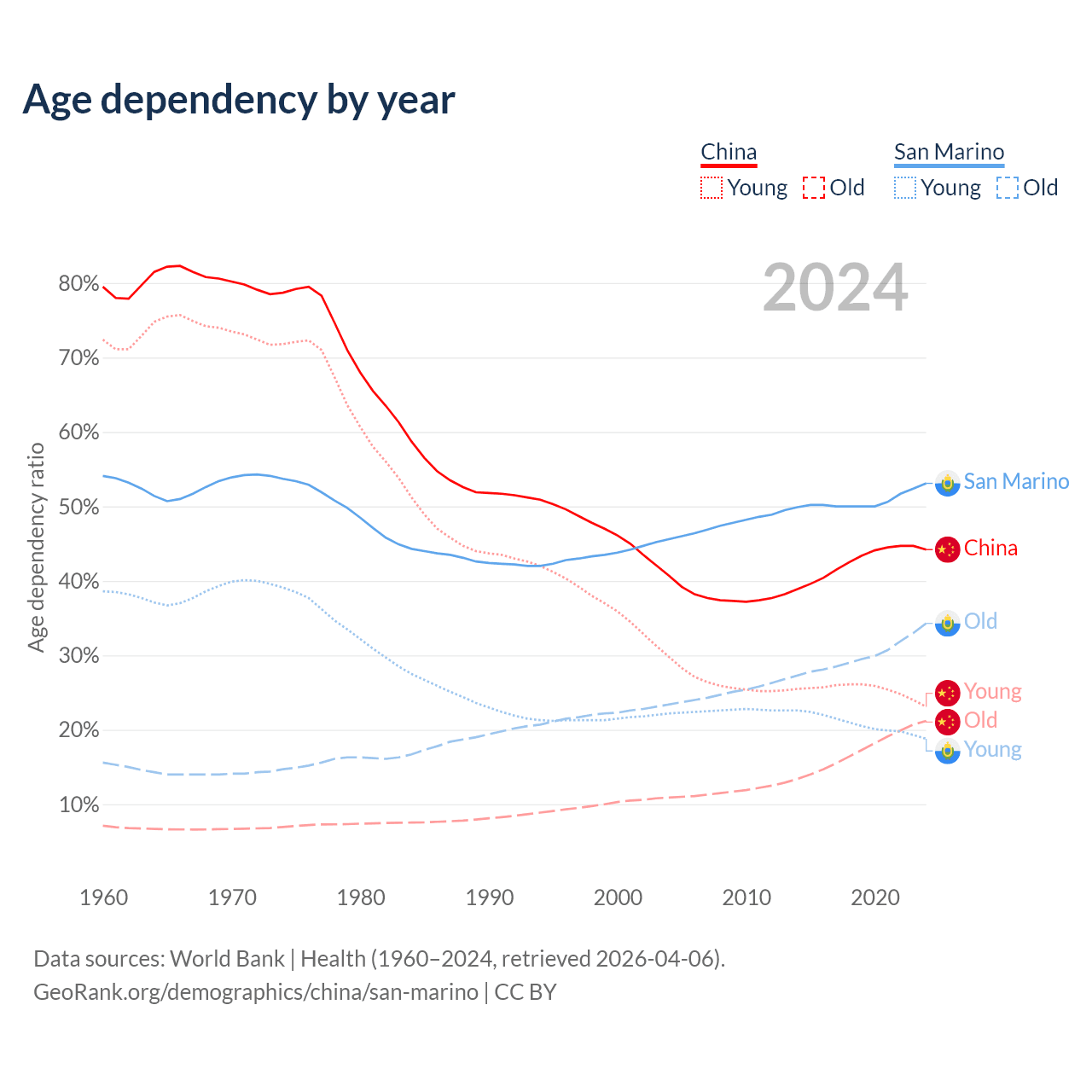- China is ranked 44/196 by median age (oldest to youngest) vs 3/196 for San Marino.