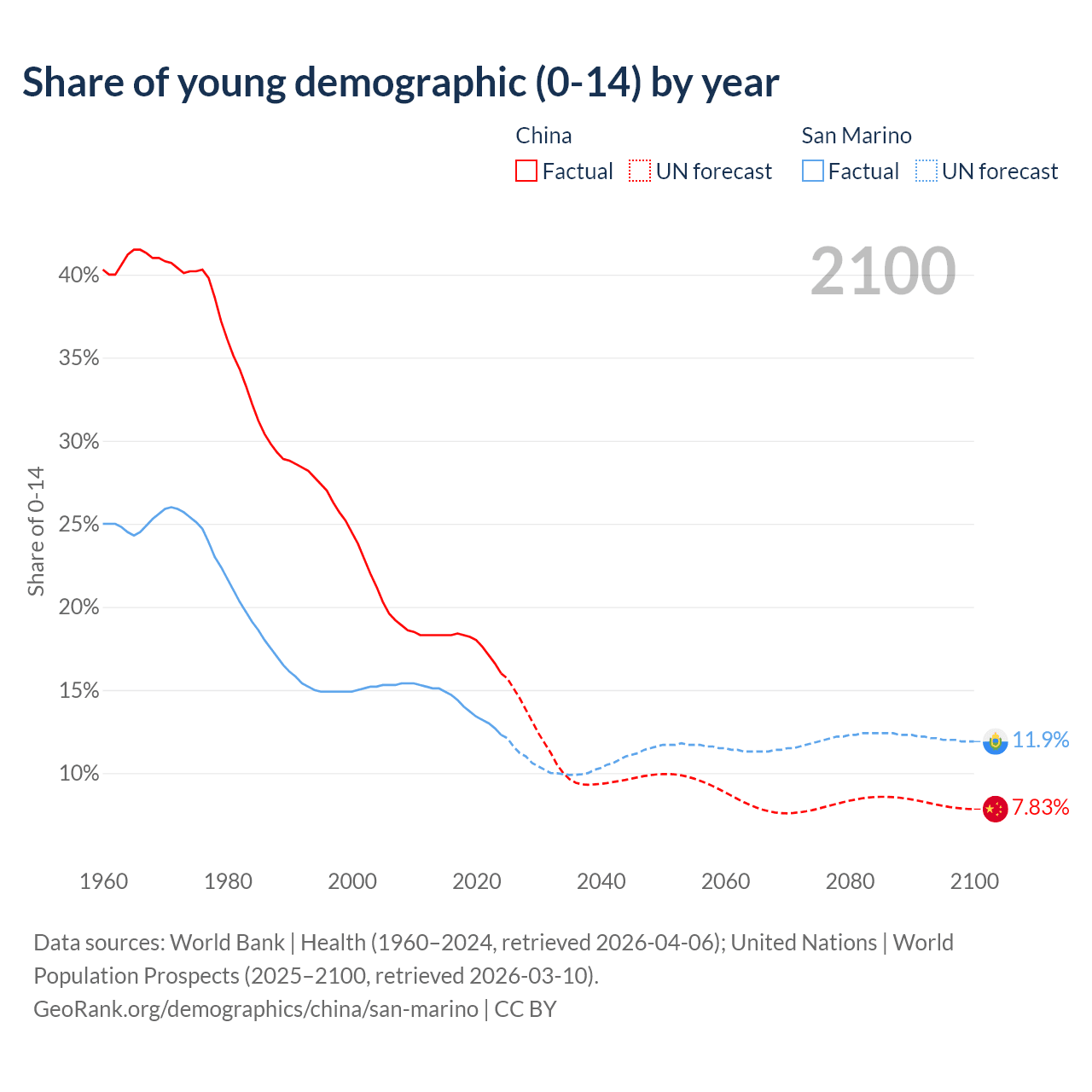 - The share of young demographic (0-15 years old) in China is 16% vs 12.3% in San Marino.