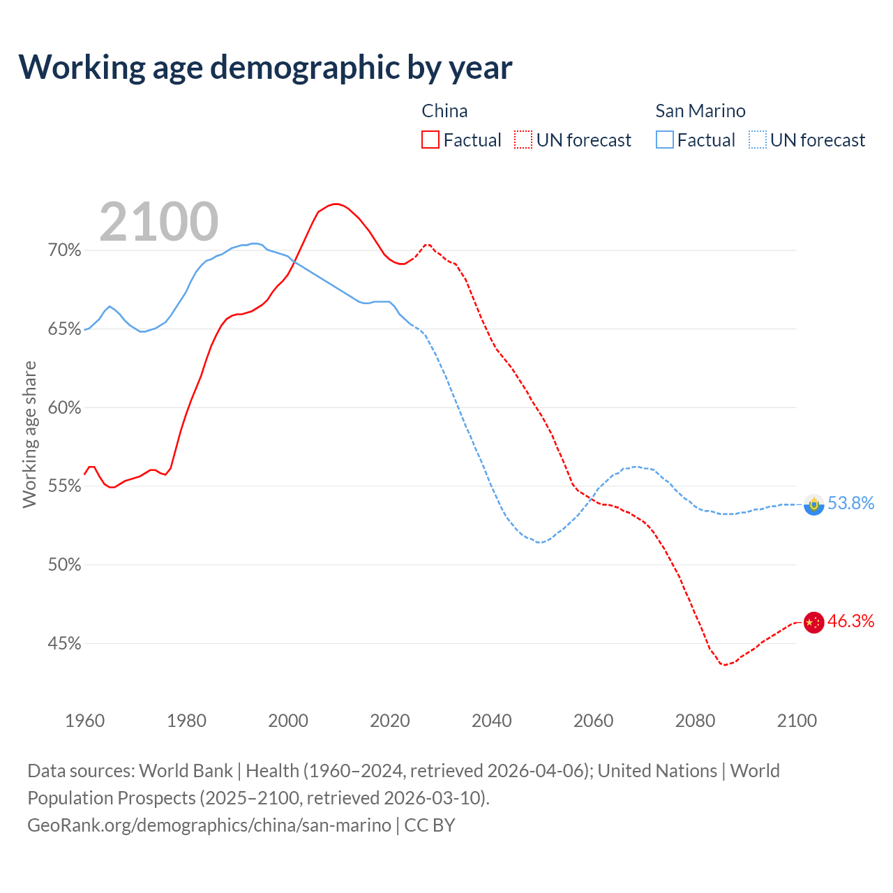 - China has 972M working age adults (aged 15-64) vs 22.2K in San Marino.