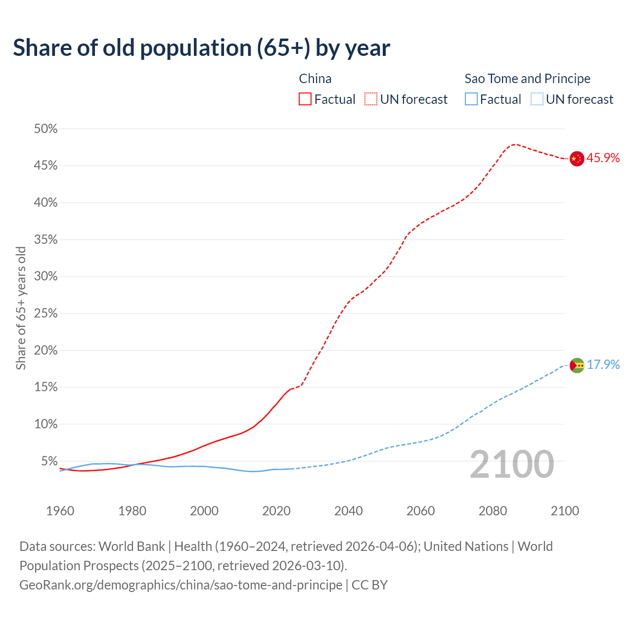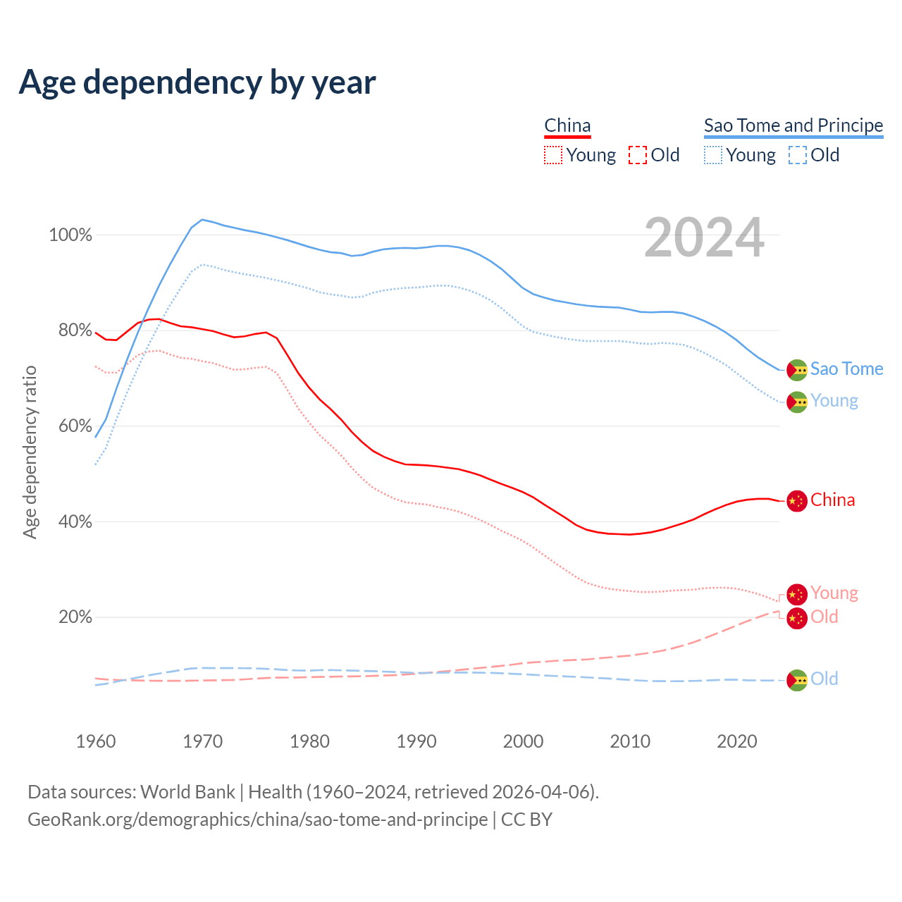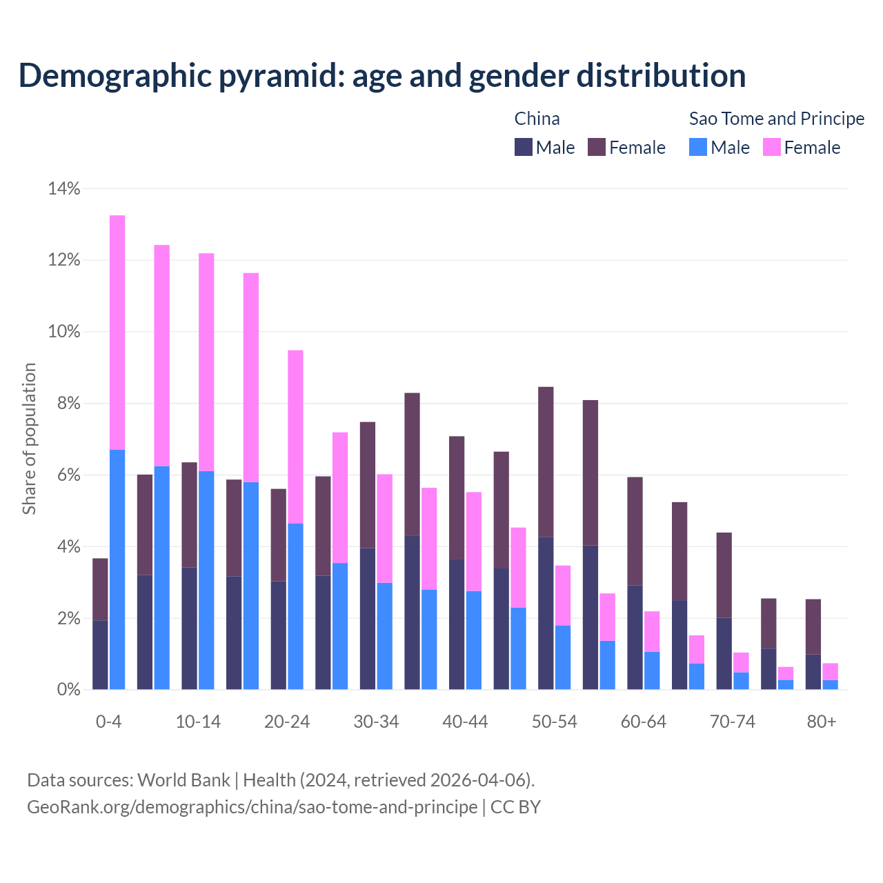 - China is ranked 44/196 by median age (oldest to youngest) vs 163/196 for Sao Tome and Principe.