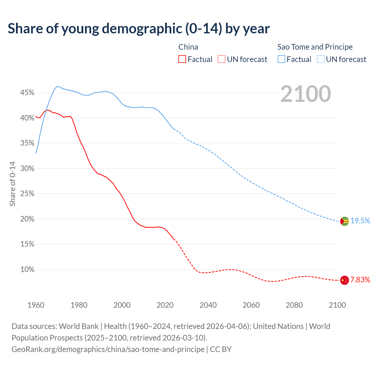 - The share of young demographic (0-15 years old) in China is 16% vs 37.8% in Sao Tome and Principe.