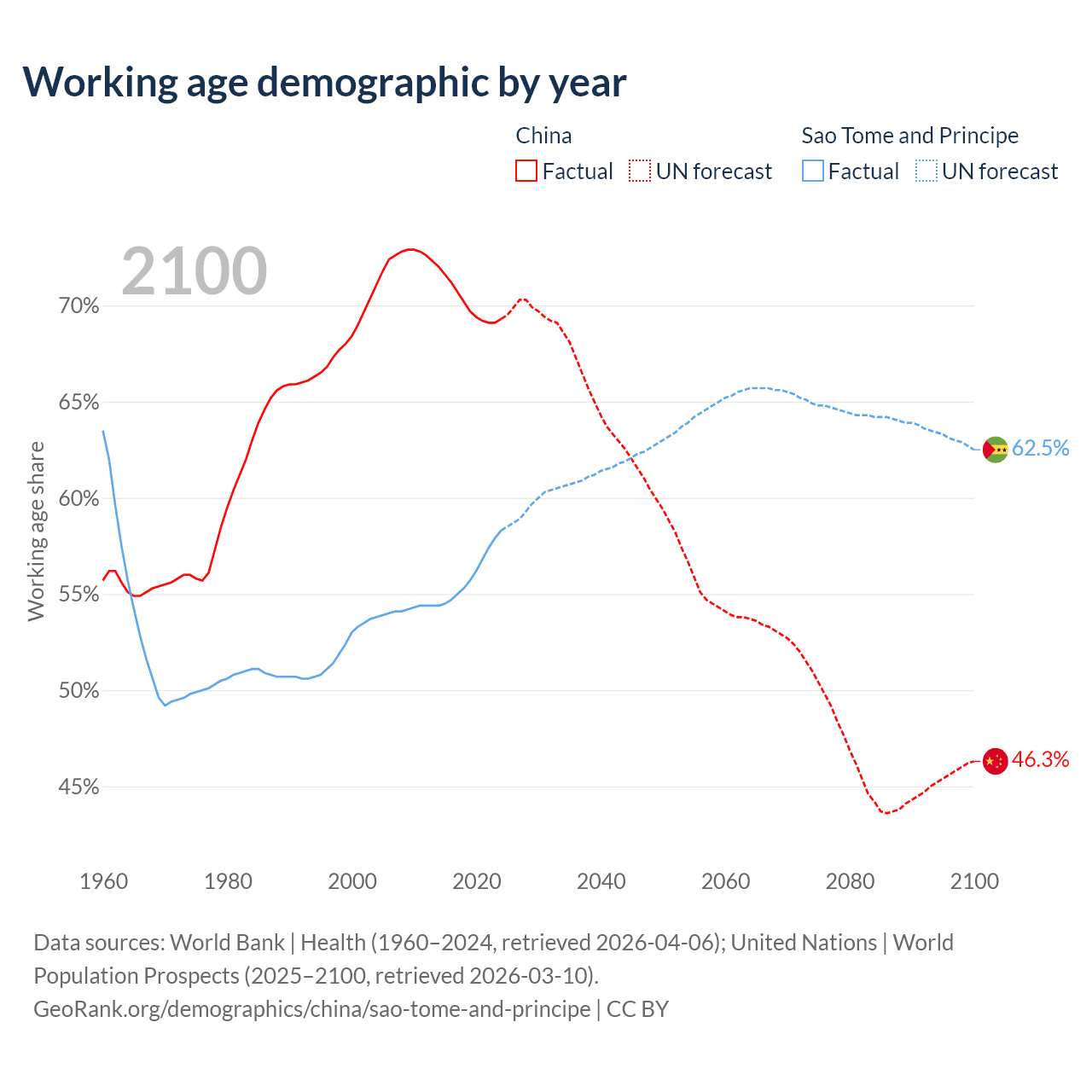 - China has 972M working age adults (aged 15-64) vs 144K in Sao Tome and Principe.