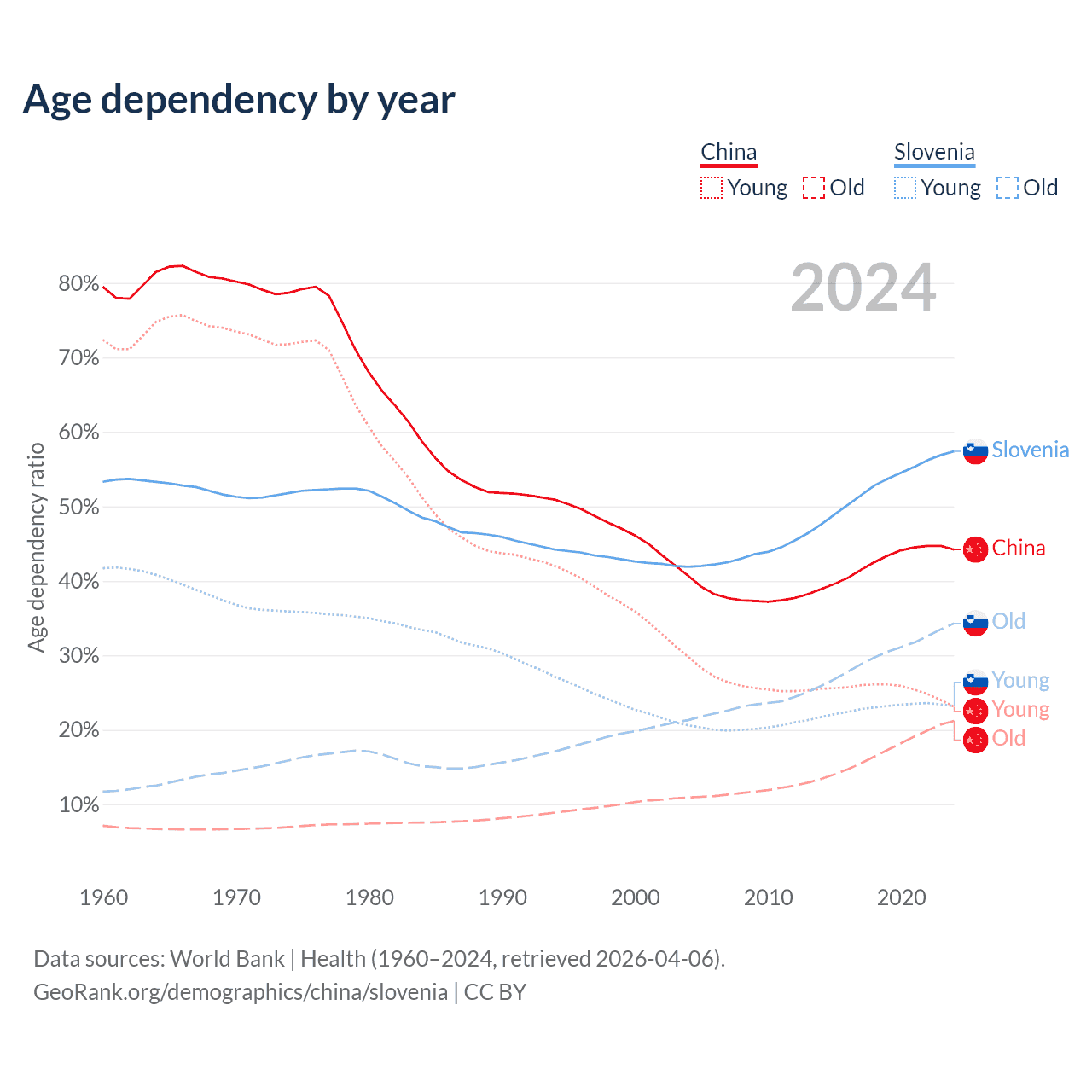 - China is ranked 44/196 by median age (oldest to youngest) vs 14/196 for Slovenia.