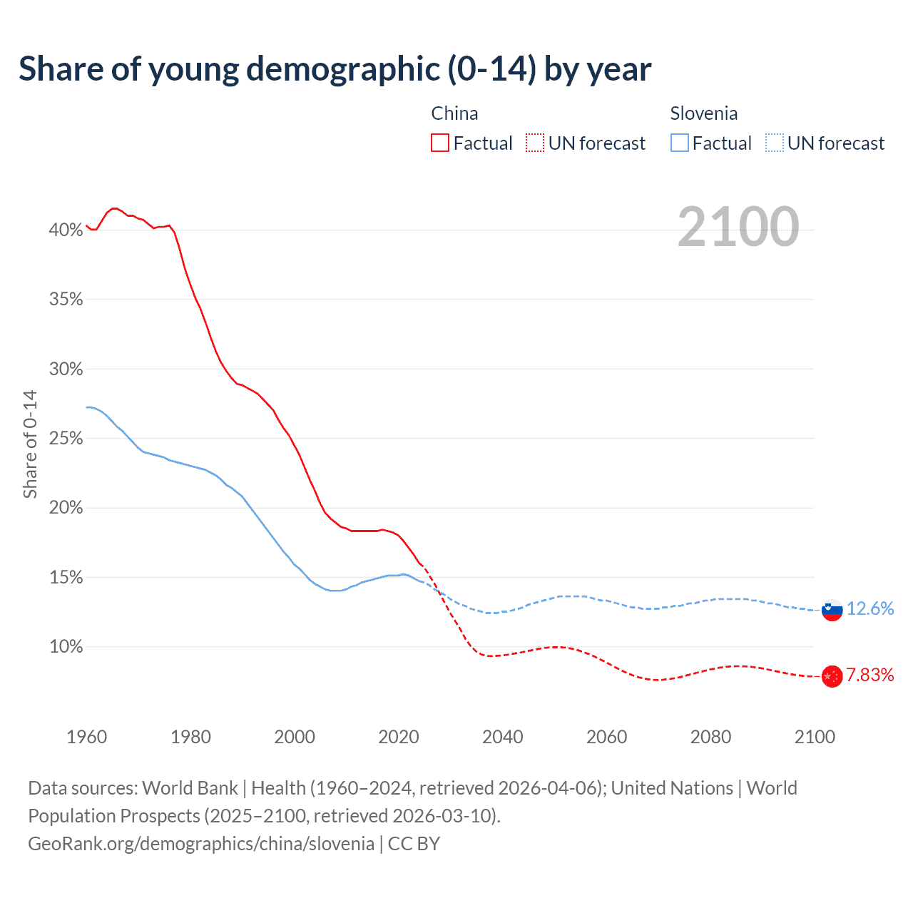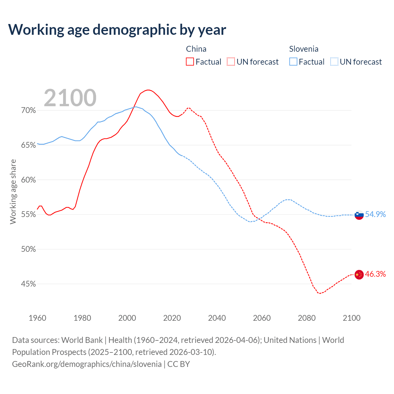Median age China vs Slovenia, 1960-2100