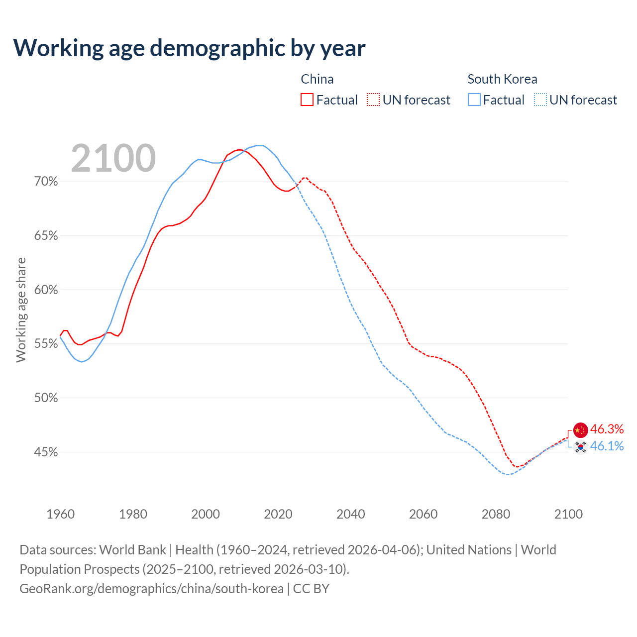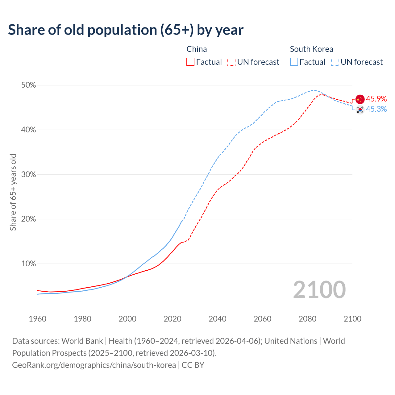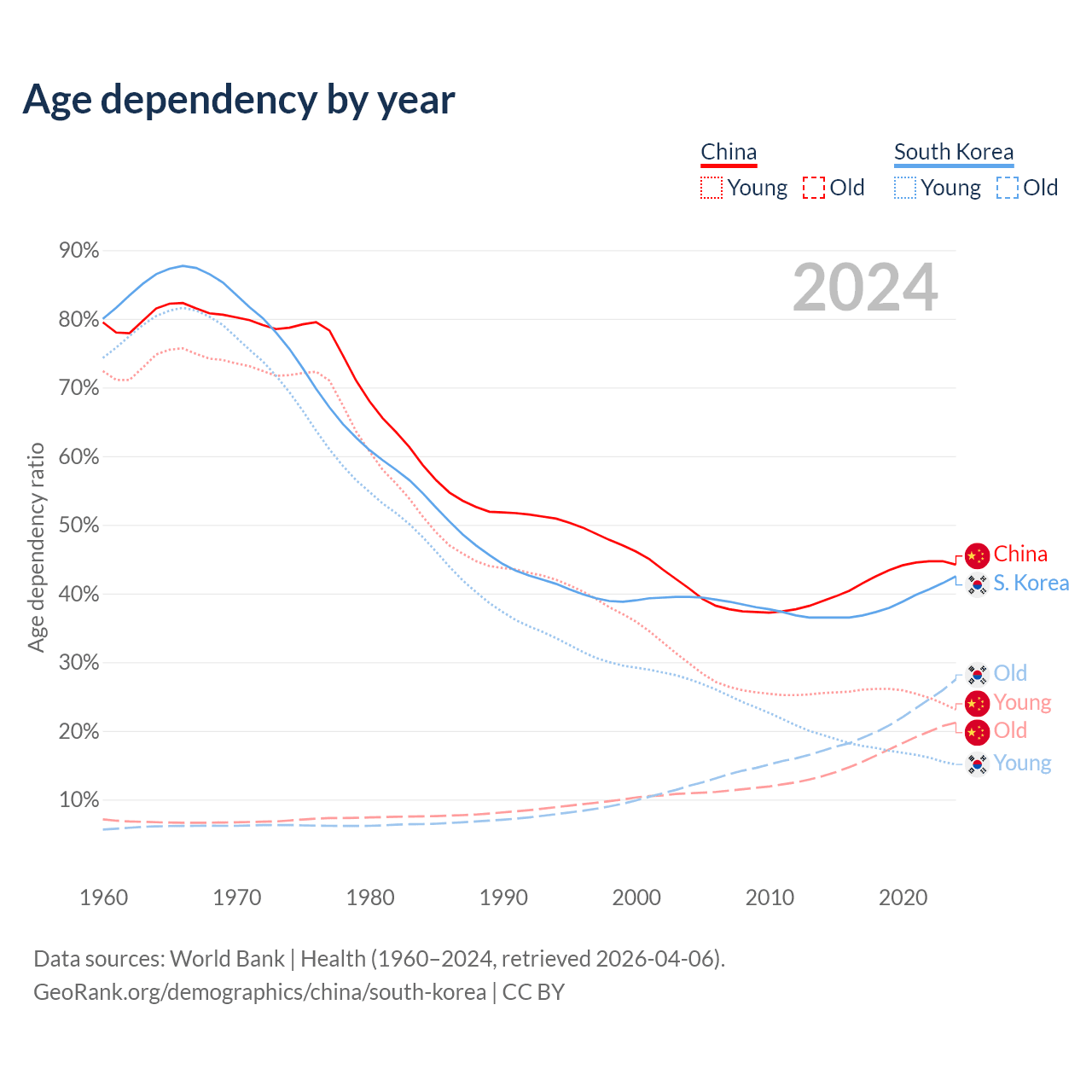 - China is ranked 44/196 by median age (oldest to youngest) vs 10/196 for South Korea.